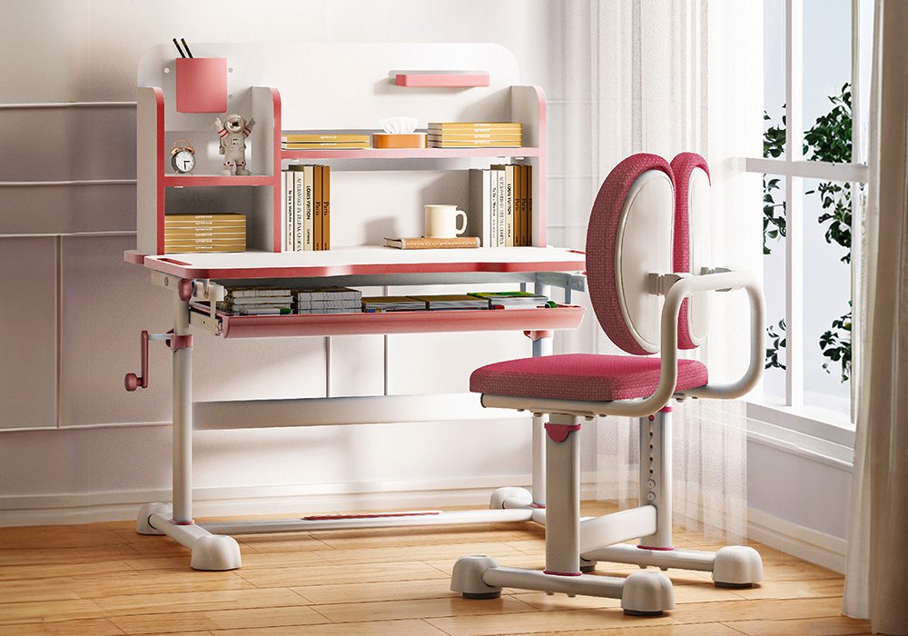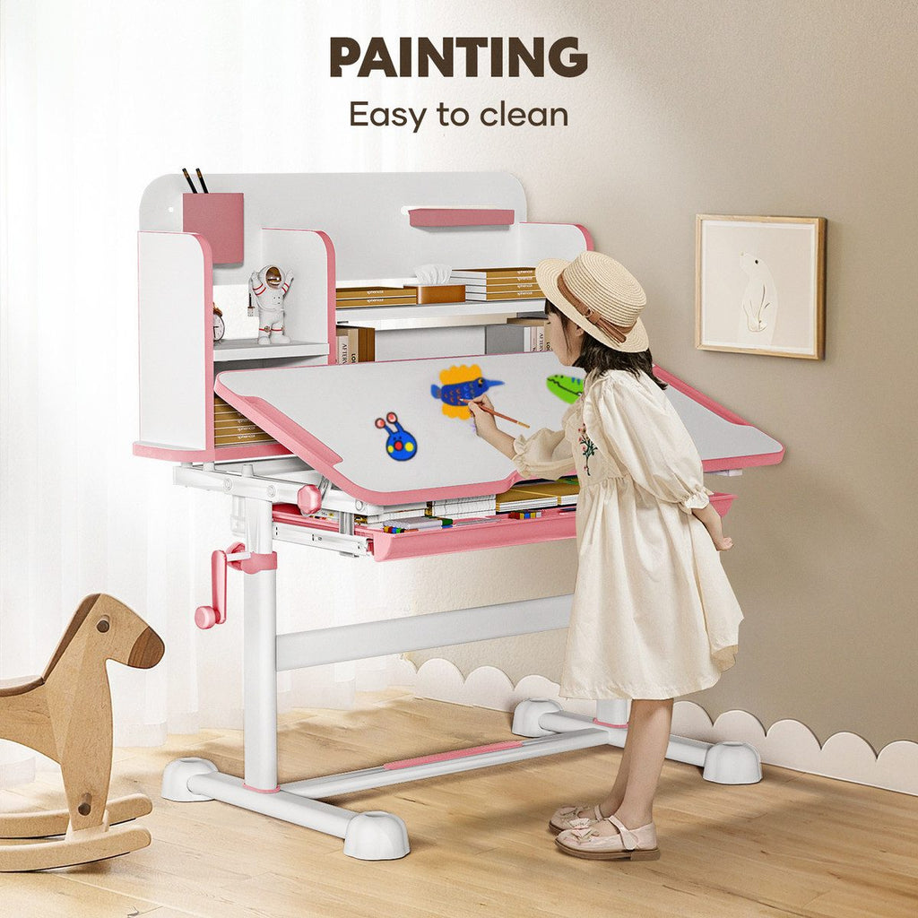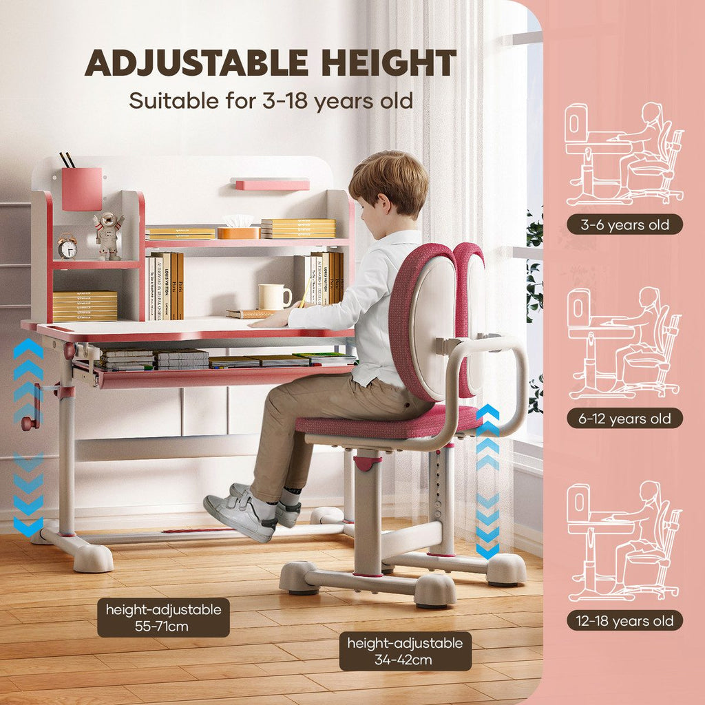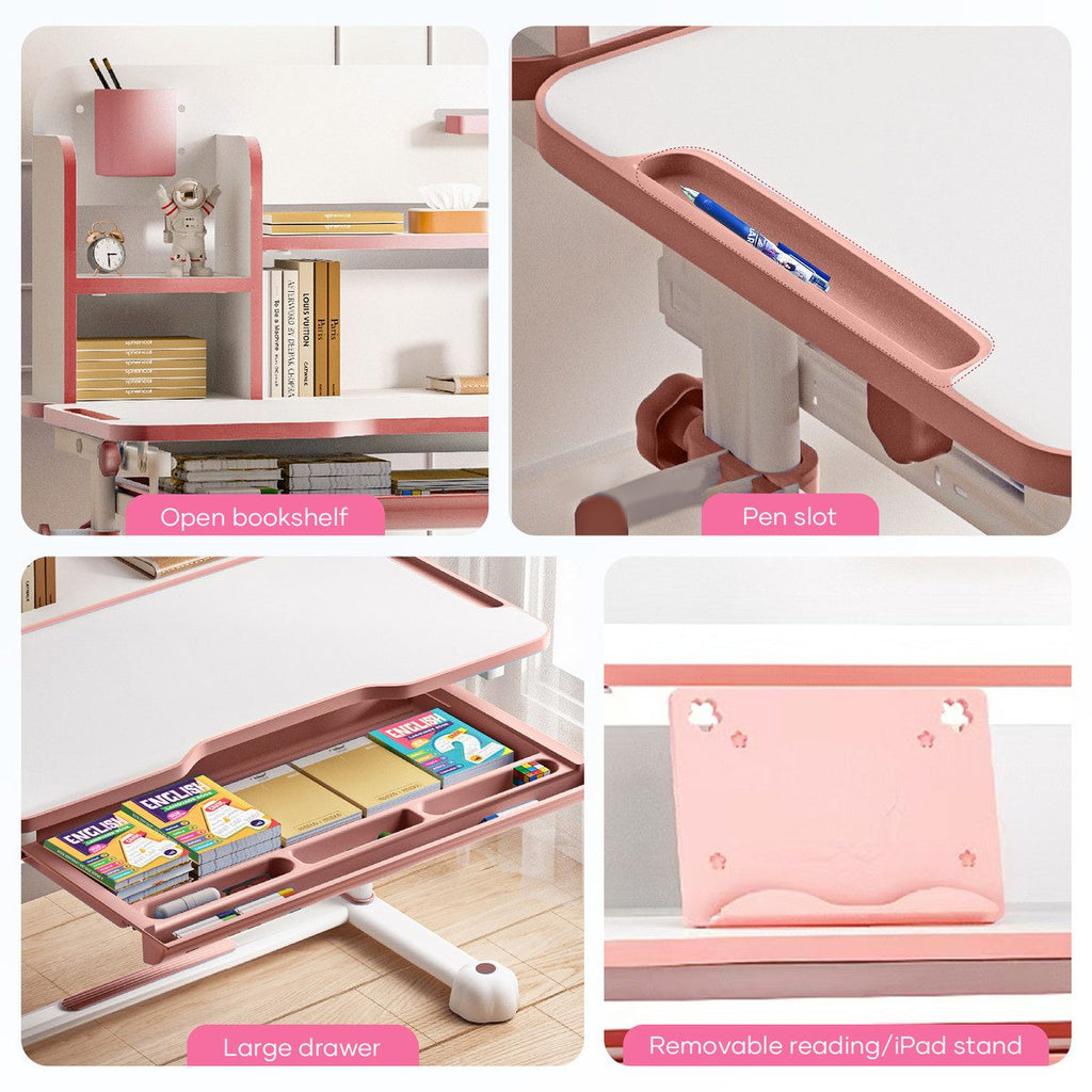 Features Space-Saving Ergonomic Design: This children's study desk and chair set features a smart storage arrangement with open bookshelves, a pen slot, a removable reading/iPad stand, and a spacious drawer. The adjustable winged backrest is designed to contour around your child's body for optimal comfort and support. Tiltable Tabletop & Adjustable Height: The tabletop can be locked at angles from 0-55 degrees, making it ideal for learning, writing, reading, and painting. Both the chair and table are height-adjustable Durable High-Quality Construction: Crafted with premium, eco-friendly materials, this set is designed to withstand daily wear and tear, ensuring long-lasting performance and excellent value for your investment. Versatile Use: While primarily a study desk Stylish Finish: The sleek pink and white colour scheme complements any room decor, adding a touch of sophistication to your child's study area or bedroom.