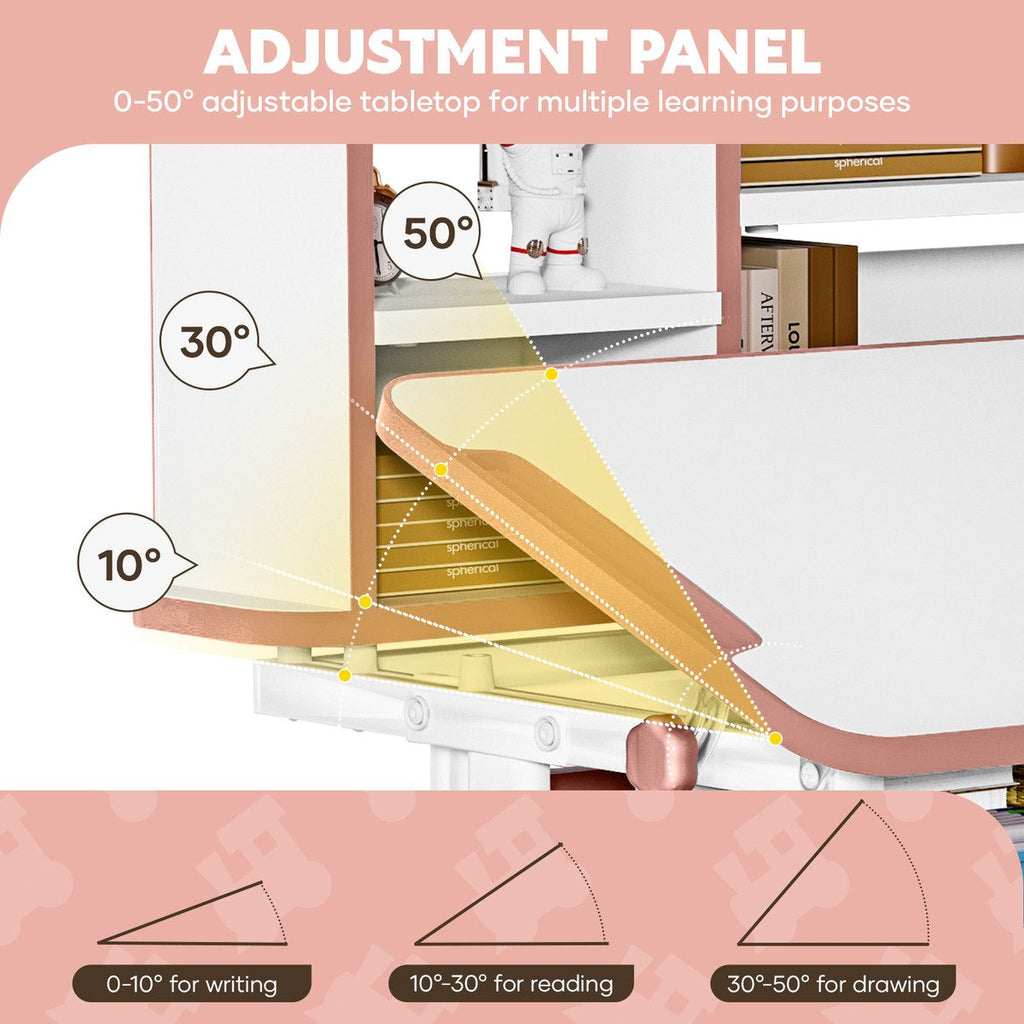 Product Create an ideal study space for your children with this ergonomic kids study desk and chair set, designed to boost productivity and focus in their daily studies. This study desk and chair are height adjustable, allowing it to grow with your child and maintain a functional study space. And the tabletop can be locked at angles between 0 and 55 degrees, making it ideal for learning, writing, reading, painting and more.