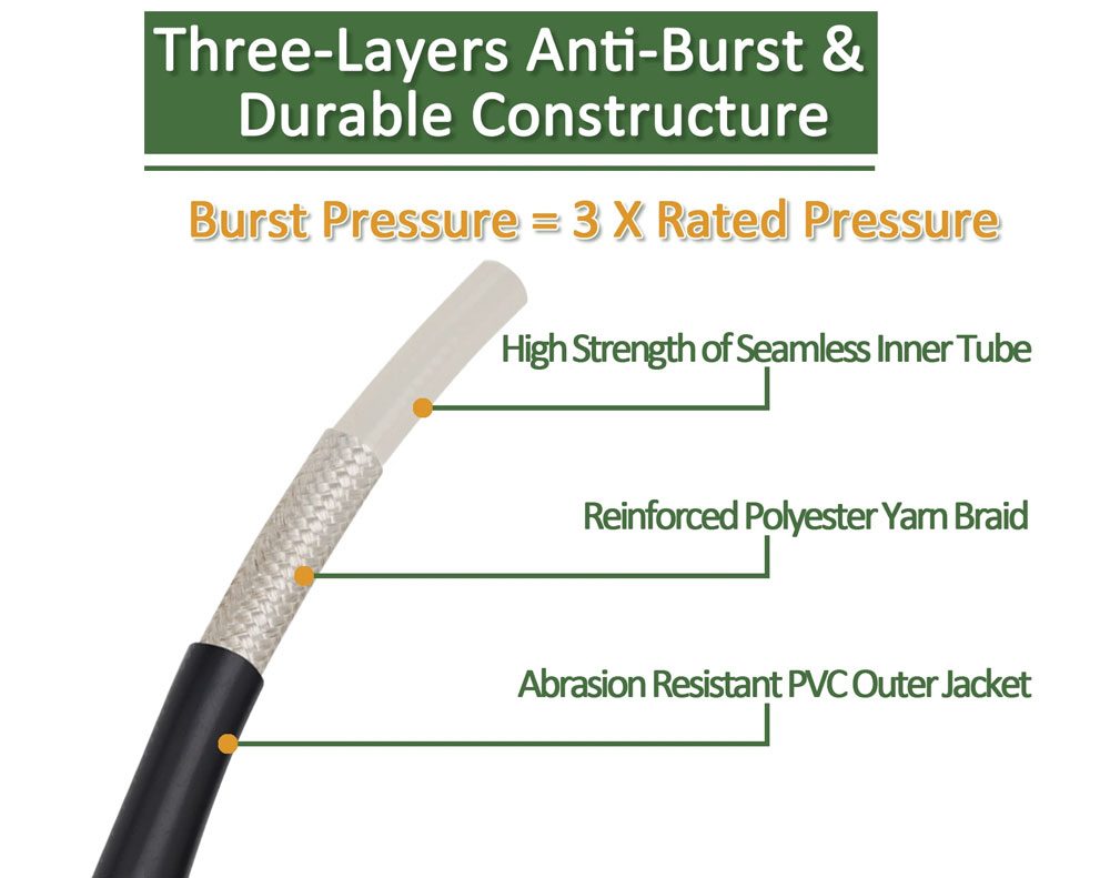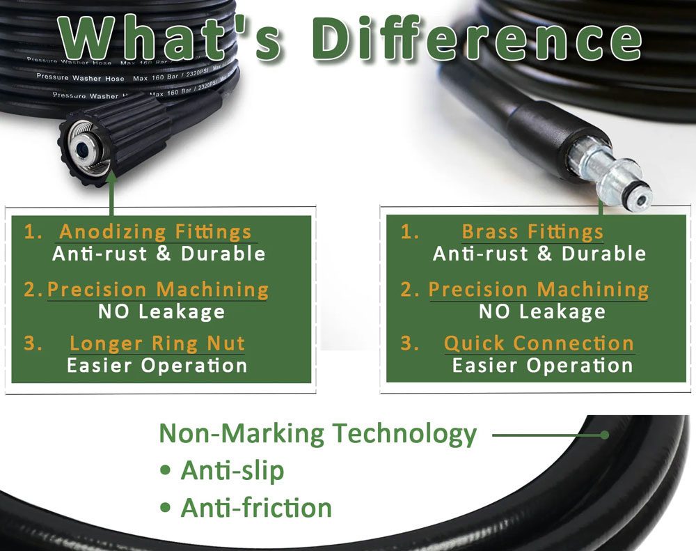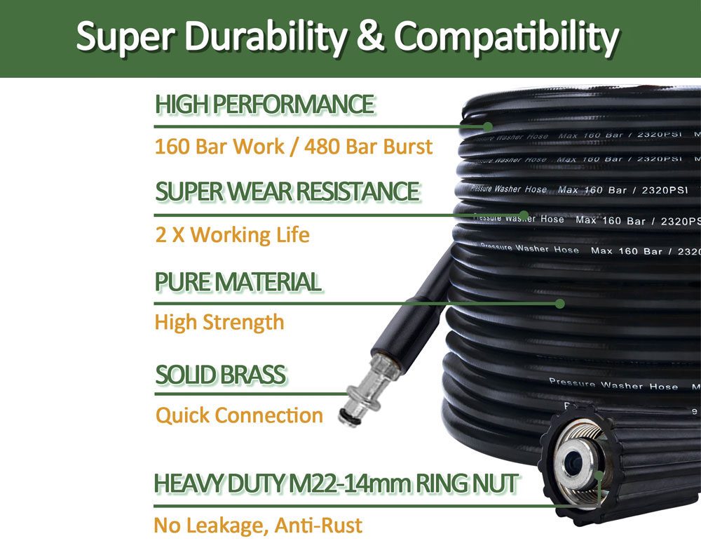 10m Pressure Washer Hose With a working pressure of 160bar and a maximum pressure of 400bar, High Pressure Hose suitable for pressure washers with pressure ranging from 1000 to 2320 PSI.