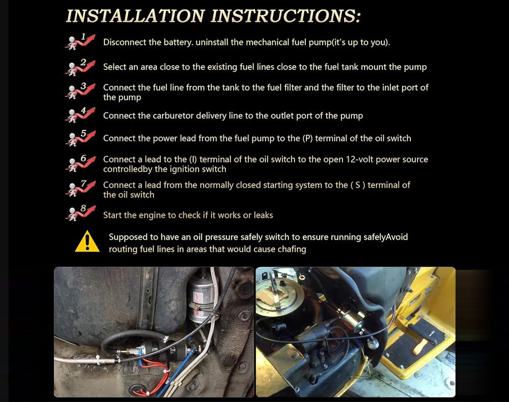 Inline Fuel Pump for direct replacement of many types, Self Regulating and Priming pumps. It Can be used to Pump other Liquids, Oil ,Water etc. Universal Electric Fuel Pump designed to replace Hundreds of Mechanical Pump Models. Perfect for domestic and commercial purposes.