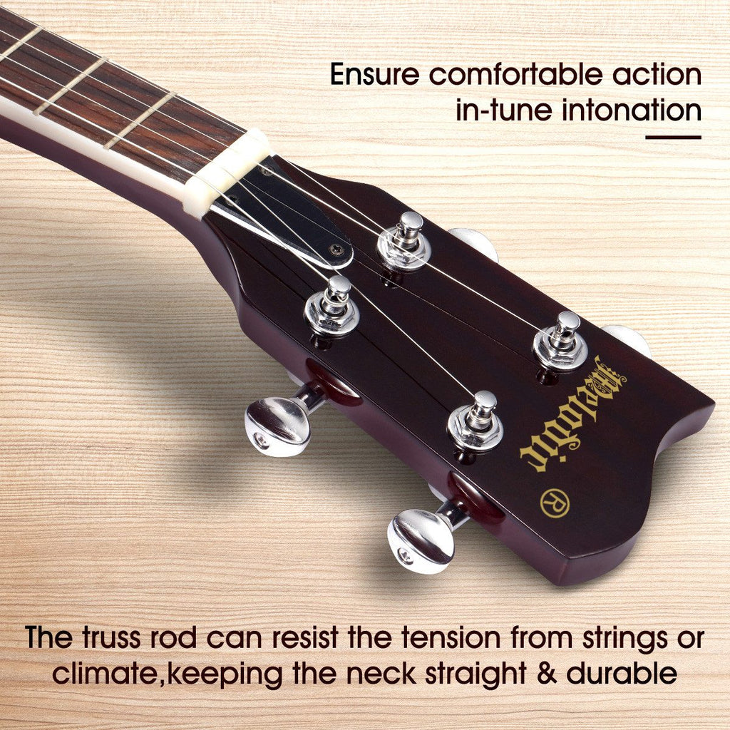 Features Solid and Durable Wood Frame: The frame's back and side are made of Mahogany, and its fingerboard is made of Rosewood, which guarantees long-term use.