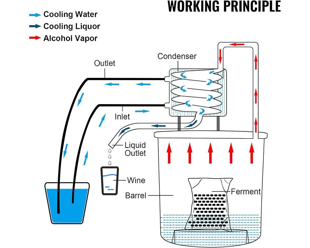 Speedy Cooling: This 21L (5 Gal) alcohol distiller features a copper coil with rapid thermal conductivity for effective cooling. Alcohol Distiller open-type cooling method ensures quick heat dissipation, while rubber pads beneath the condenser help insulate heat, ensuring optimal cooling performance.