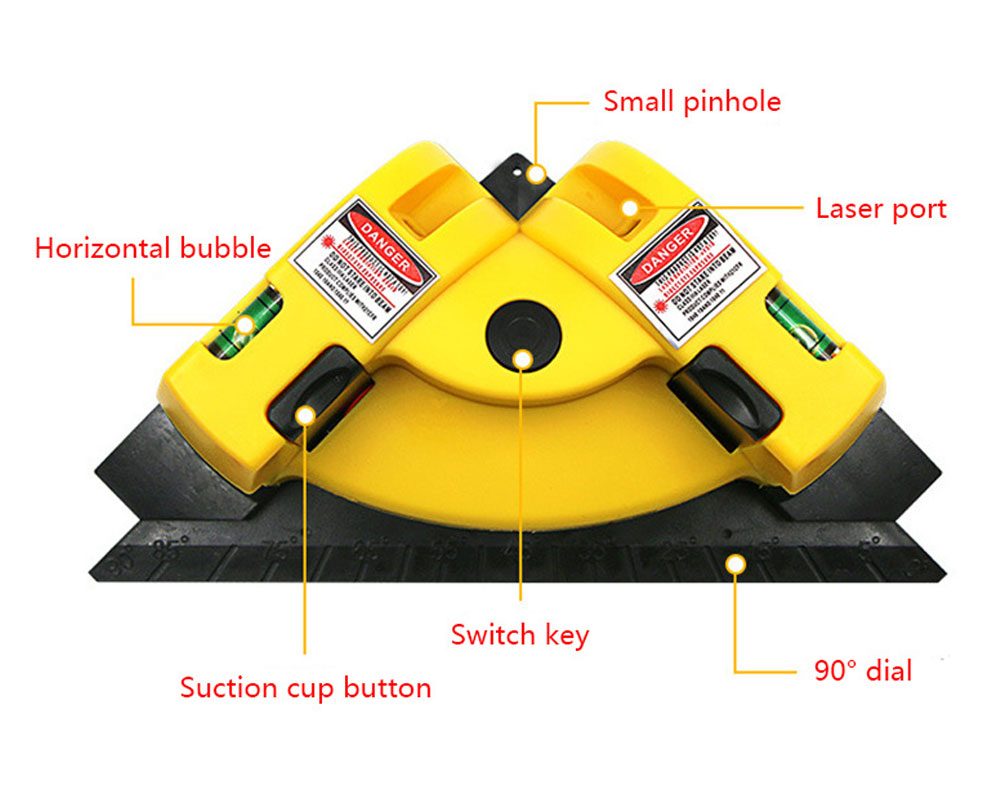 Right Angle Laser Level Projects horizontal and vertical laser lines at 90 degrees for easy layout and installation of floors, tiles, paneling, wall fixtures, wallpapering, stenciling, wainscoting, and finish carpentry.