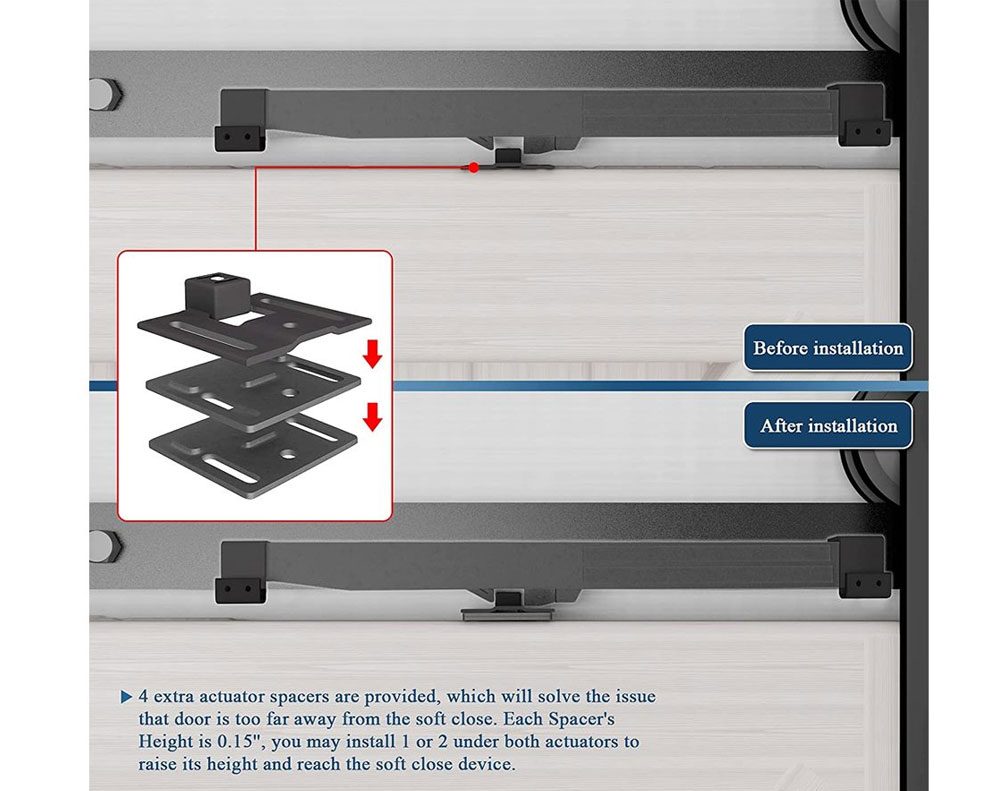 2 * Barn Door Soft Close Spring Buffer Damper 2 * Actuators 4 * S-Shape Hooks 4 * Screws 1 * Wrench 1 * Manual
