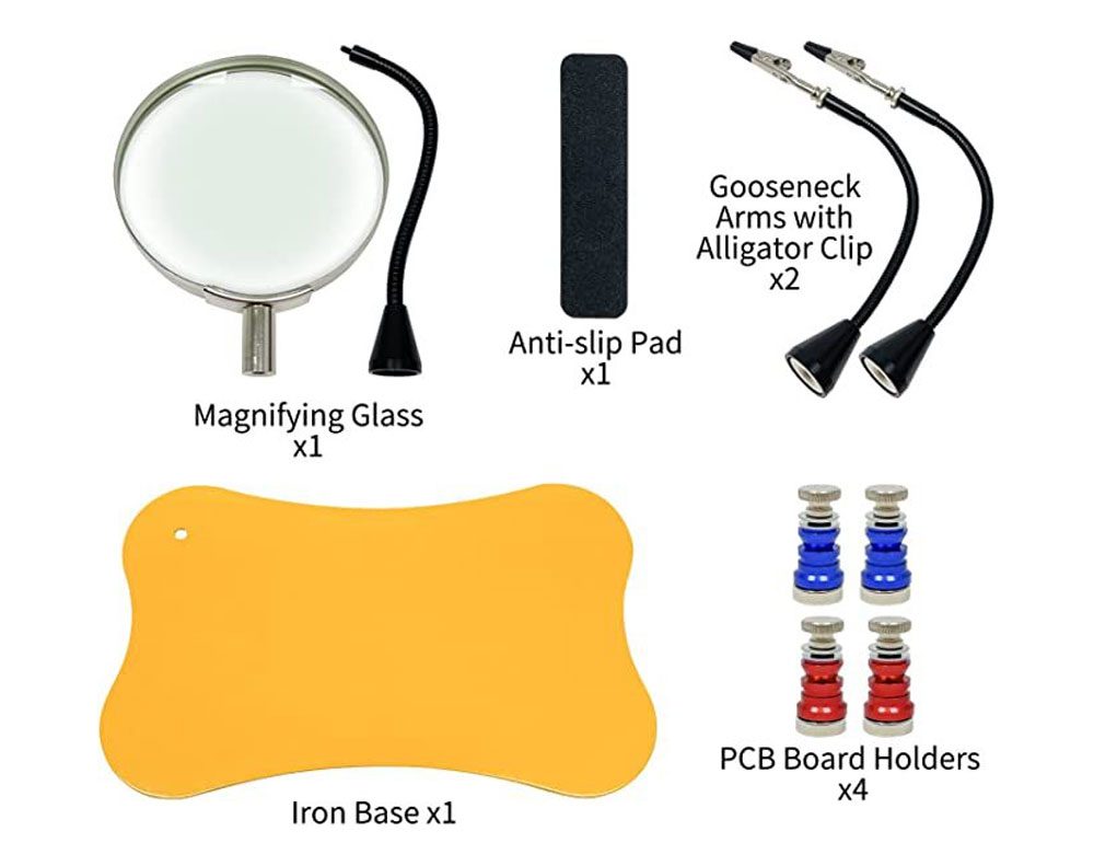 1 * Iron Base 1 * Gooseneck arm with Magnifier 2 * Serpentine tube with alligator clips 4 * Magnetic PCB Board Fixed Clips