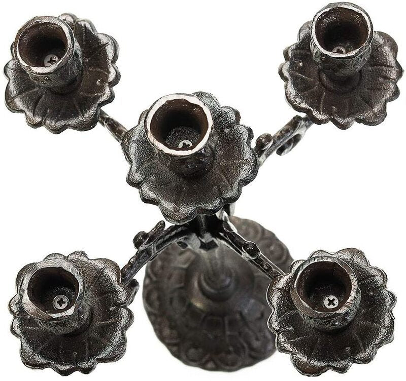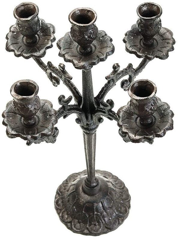 This old-world design candelabra will make an elegant impression on your table or mantel. It's composed of high-quality cast iron for long-lasting durability and a classic look. The design of this candelabra is excellent. ABSOLUTELY BEAUTIFUL!
