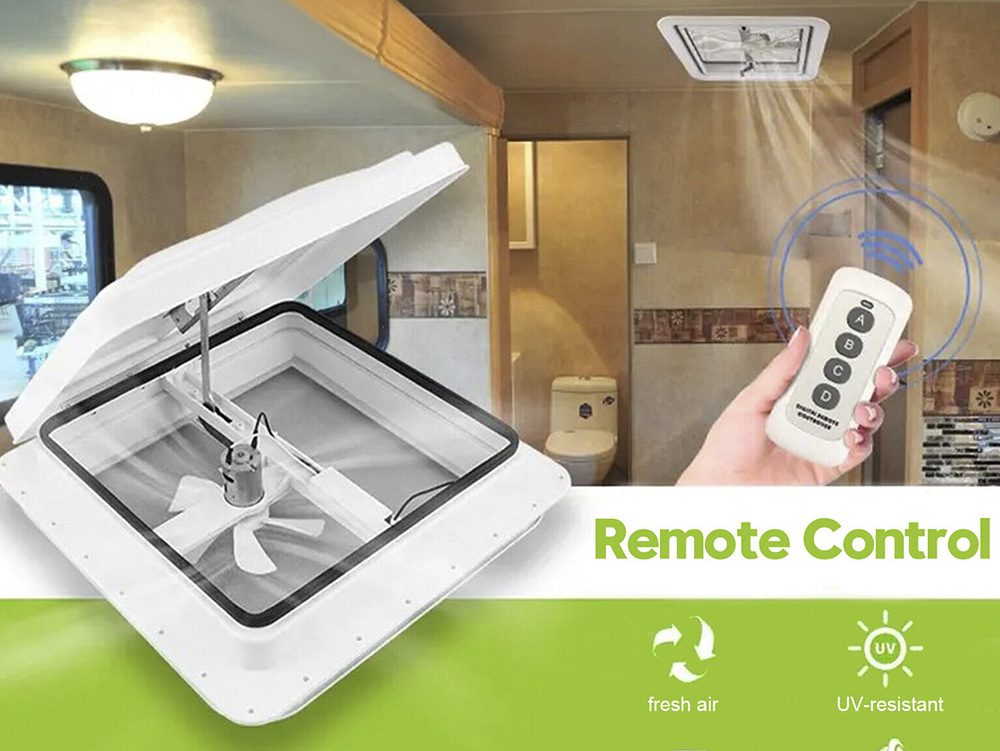 FEATURES: -Built in 12v fan -Flynet Screen -Blackout blinds -Speed adjustable -With Remote Control Compatible with 1-1/4" to 2-1/4" thick roofs -Seamless one-piece frame that is leakproof and weatherproof -Built-in screen allows air to pass through while keeping insects out -Overall Vent Size is 420mm x 420mm -The cut hole needs to be 355mm x 355mm -Battery not supplied - Must be purchased separately