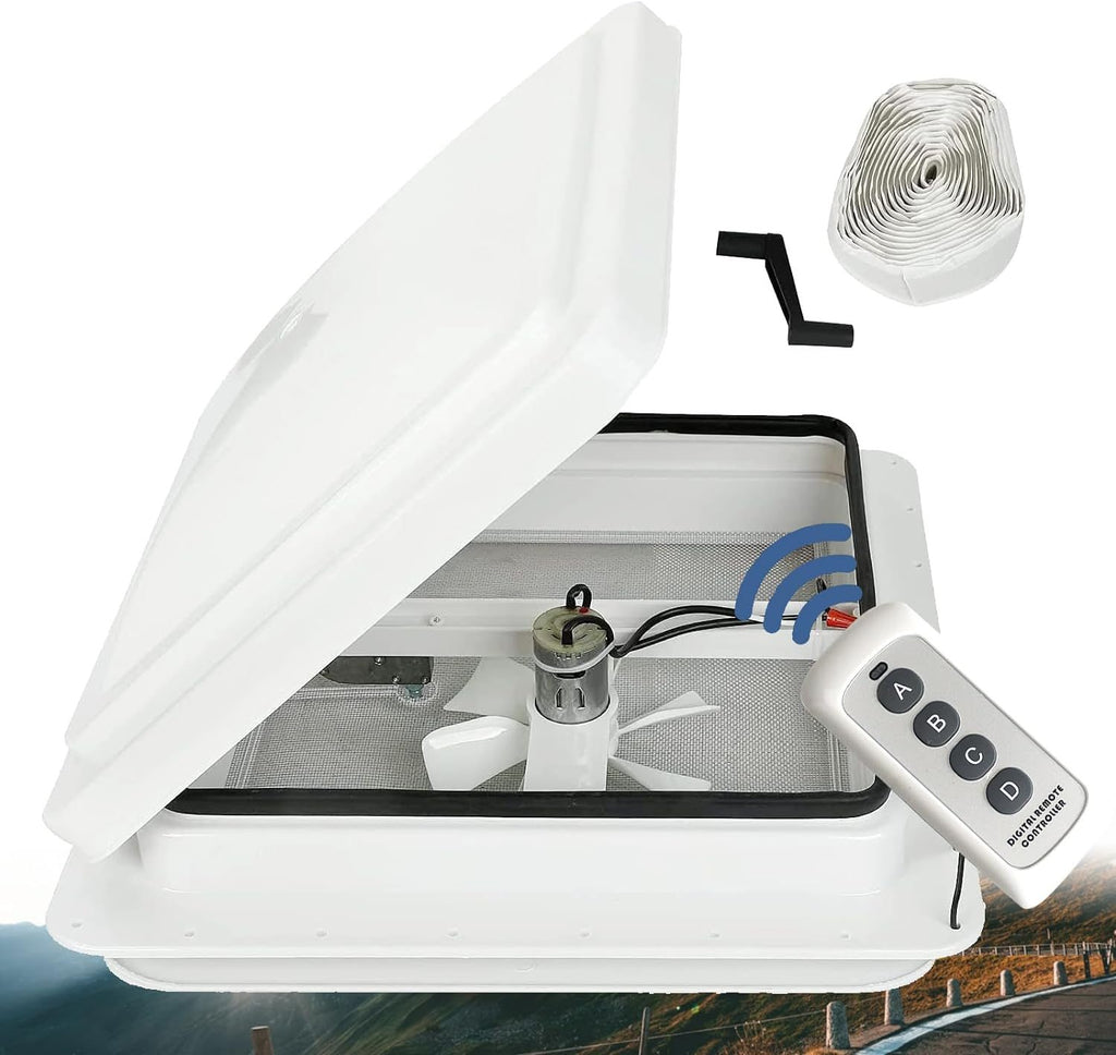 Enhanced Ventilation and Air Circulation: Equipped with both air in and out functions, this roof vent fan facilitates the inflow of fresh air and the expulsion of odors, smoke, pet smells, and food scents. Its powerful performance ensures excellent air circulation, creating a more pleasant atmosphere inside your vehicle. Durable and Weather-Resistant: Crafted from high-quality UV-resistant and waterproof plastic material, this roof vent is built to withstand various weather conditions. Its durability ensures long-lasting use, making it a reliable choice for your RV ventilation needs. Convenient Features: Built-in 12V fan for efficient air circulation Flynet screen to keep insects out Blackout blinds for added privacy Adjustable fan speed for customized ventilation