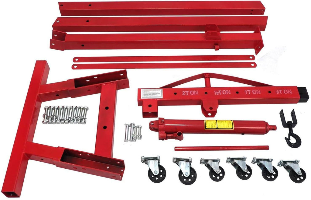 Color: red G.W.: 67kg ± 2kg Max. lifting height: At the MIN. Boom extension: 90.5" - 94.5" At the MAX. Boom extension: 74.8" Boom Extends: 41 4/5"-63" Ram capacity: =8 Ton Max. loading capacity: 4400 lb / 2T Material: heavy gauge structural steel Adjustable positions: 0.5, 1, 1.5, 2 Ton / 1100, 2200, 3300, 4400 lb
