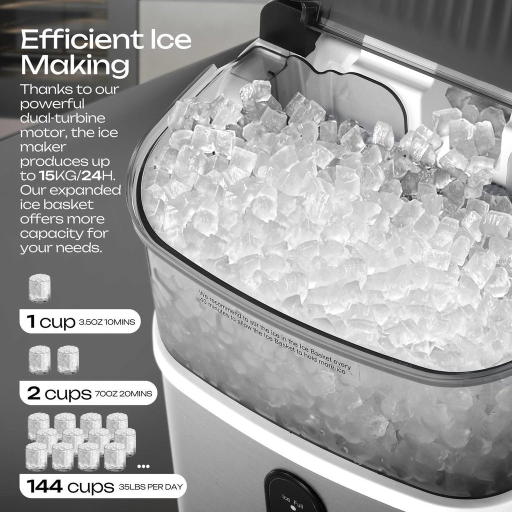 Rapid Ice Production: The nugget ice maker machine is remarkably efficient. With its 1.1-litre water tank, it produces 15kg of ice within 24 hours.