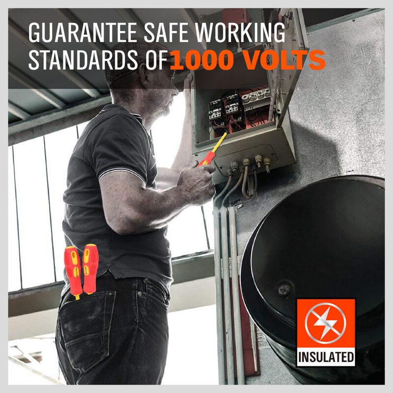 Cr-v steel with heat treatment, high hardness and good toughness and resistence. Black finish blade with magnetic tips which could conveniently attracts screws. Plastic blade cover and special material which makes it durable and not easily broken down. With ergonomic TPR handle and button on it, it helps you to use very easily. Insulated blades for Electrical applications, Protects from electric shock up to 1,000 volts