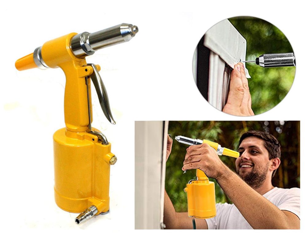 This pneumatic rivet gun is powered by compressed air and installs blind rivets very quickly. It delivers the ultimate high-speed pneumatic tool performance, recommended for the most difficult rivets to fasten.