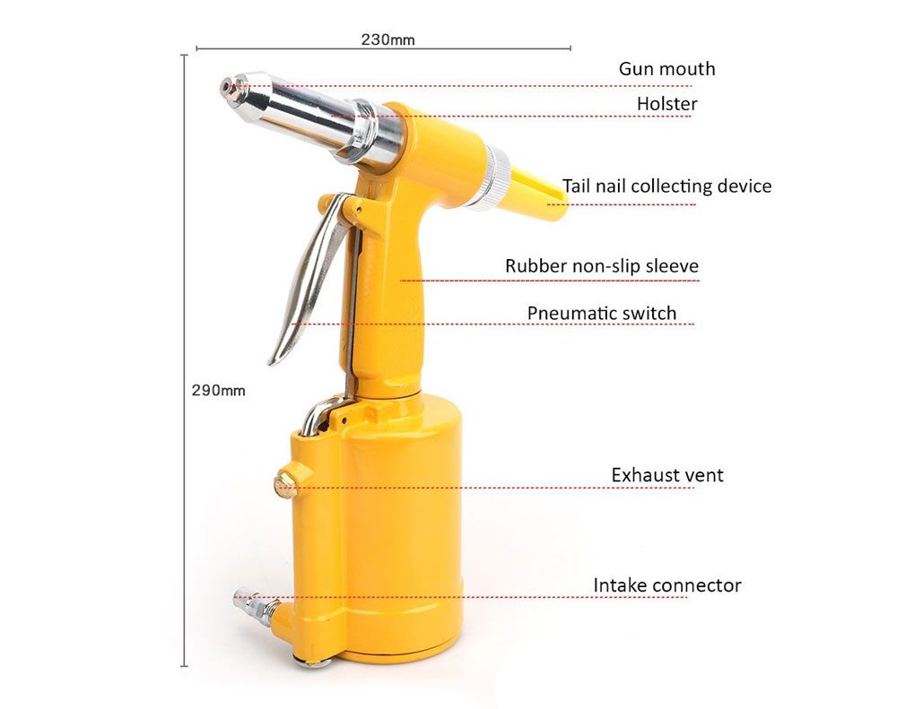 Accelerate your fastening projects with our powerful pneumatic rivet gun. Designed for rapid and efficient installation of blind rivets, this industrial-grade tool delivers exceptional performance on aluminum and steel materials. Featuring a quick-release air valve and interchangeable nosepieces