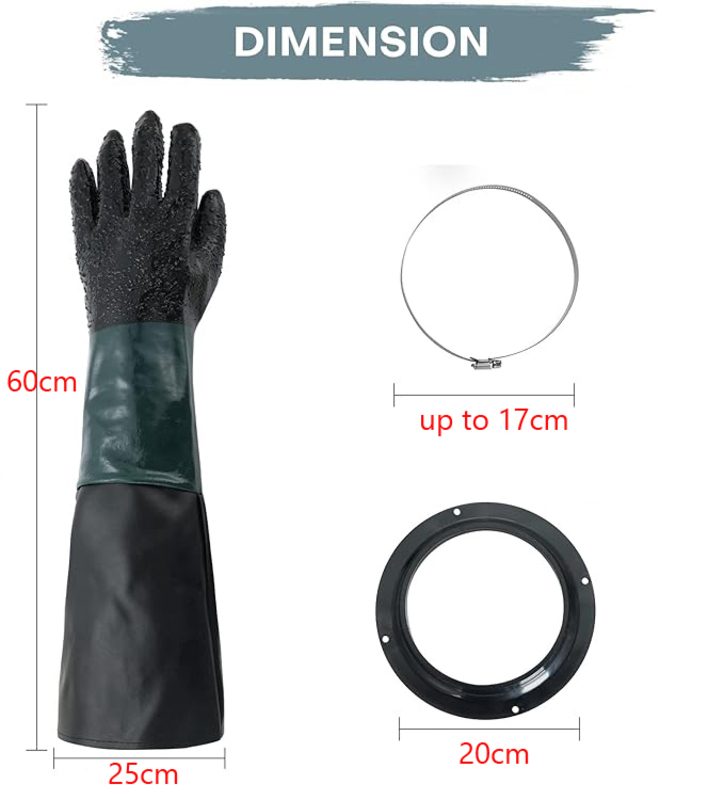 - Perfect Design:The gloves have a cotton lining for comfort and a rough rubber surface for easy gripping of items.Cotton lining can absorb sweat, not allergic to the skin. Vinyl sleeves can protect arms. Gloves fit most sandblasters.