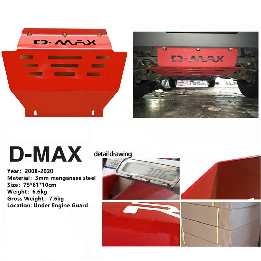 Specification 3mm Steel Red Bash Plate Front Sump Guard for Isuzu D-MAX MUX 2008-2020 Product Name: Bash Plate. Color: Red. Material: Steel. Surface: Powder Coated. Thickness: 3mm. Number of piece: 1pcs Bash Plate Set. Package size: 75576 cm. Shipping Weight: 7.1 kg.