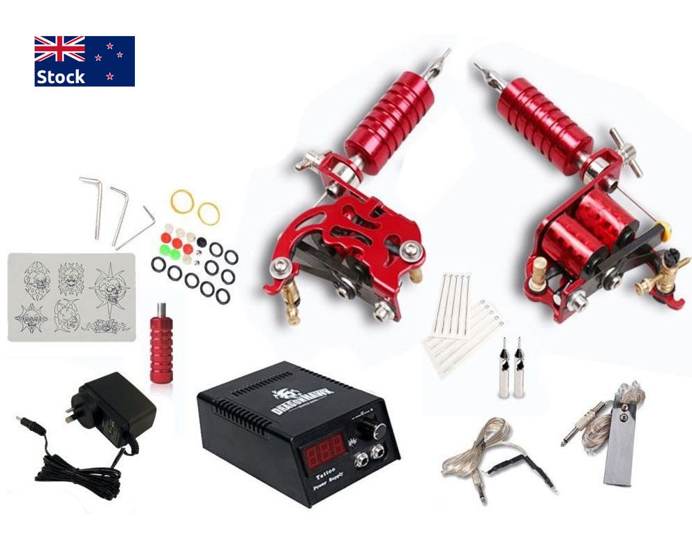 1 * Tattoo machine 1 * NZ Power Adopter 1 * Power Supply System 1 * Professional grips 10 * Tattoo needles 2 * Steel Tattoo tips 3 * Medium Tattoo Ink Cup 3 * Small Tattoo Ink Cup 1 * Thick Practice Skin 10 * Grommet keep needle steady 10 * O-ring sure spring smooth 1 * Adjustment tool set for machine