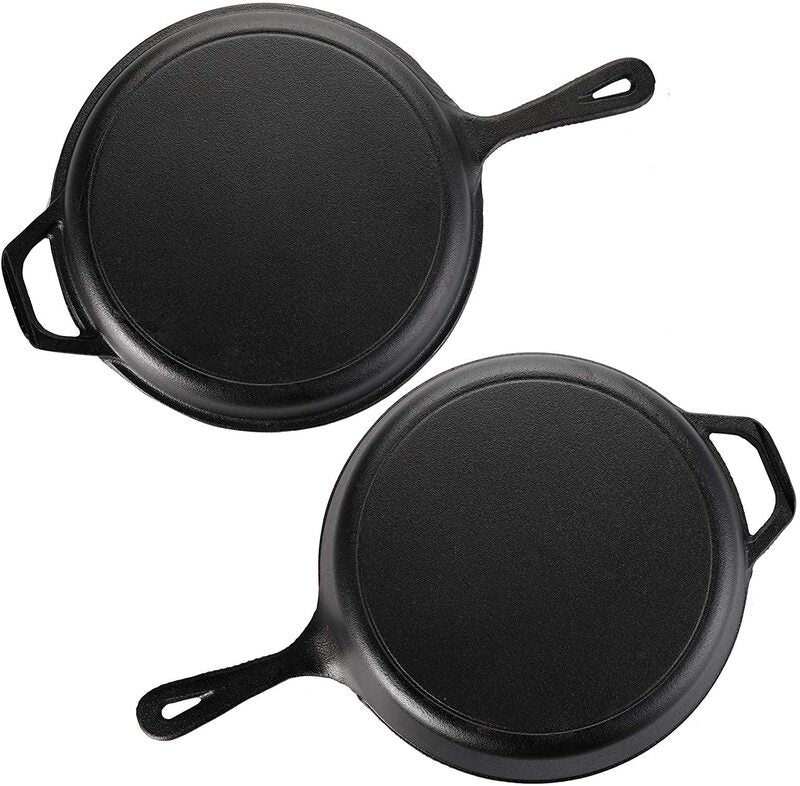 - The set includes 2 pack cast iron dutch oven skillet measuring 10.4 inch diameter, each has double assist handles. 2-In-1 shallow skillet can be used a lid with perfectly fitted lip for deep skillet.