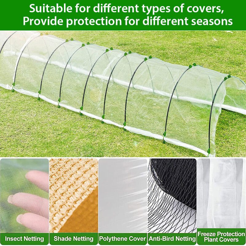 - These row cover hoops are made of fiberglass, sturdy, stable, and not easy to rust. They can withstand the changeable weather throughout the year and can be stored for reuse.