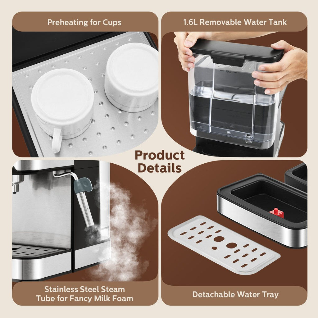 Product: Create barista-quality beverages easily with our 20 Bar Espresso Coffee Machine. Crafted with durable stainless steel and plastic, it boasts a 20-bar pressure system, ensuring rich and full-bodied espresso shots. Meanwhile, its 1.6-litre removable water tank allows for convenient refilling, while the powerful steam frothing system and adjustable steam control ensure you make velvety and creamy milk foam for your favourite lattes and cappuccinos. With the single- and double-cup functions, you can effortlessly prepare the perfect shot for yourself or share the joy with a friend or loved one. Further, the preheating system guarantees your cup is warmed and ready to receive your freshly brewed espresso, while the removable drip tray simplifies cleanup. Designed with safety in mind, the espresso machine is equipped with protection against overheating and overpressure.