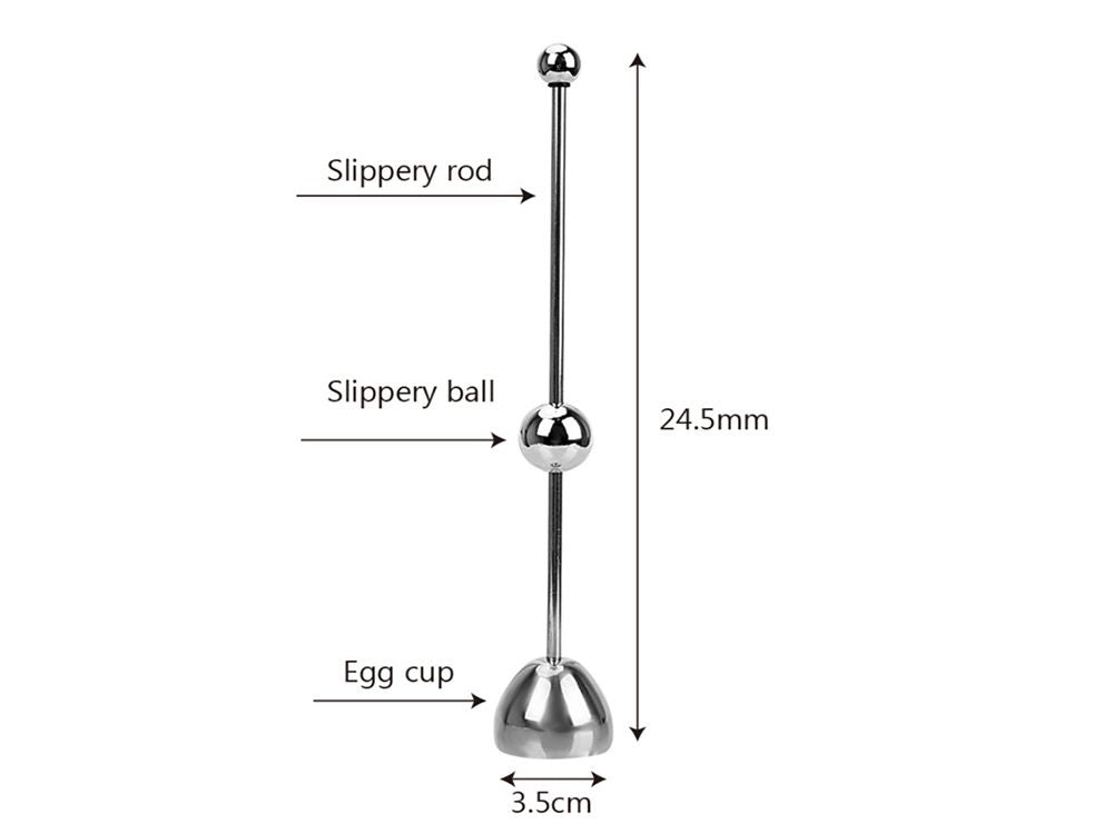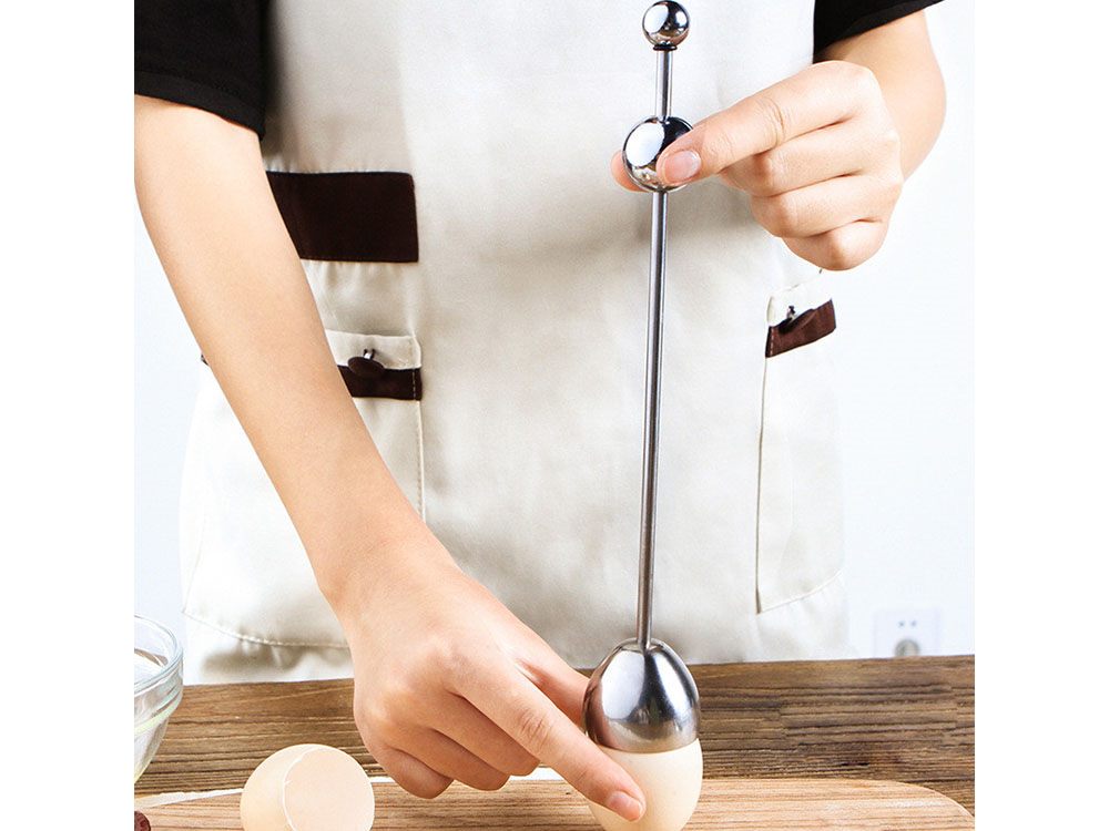 - Easy to use, put the egg cup on top of the pointed end of the egg move the ball up the metal rod and dropped the ball, the dome will vibrate only around the top of your egg once the ball is dropped and then cracks the egg in a small perfect circle in the top of the egg.