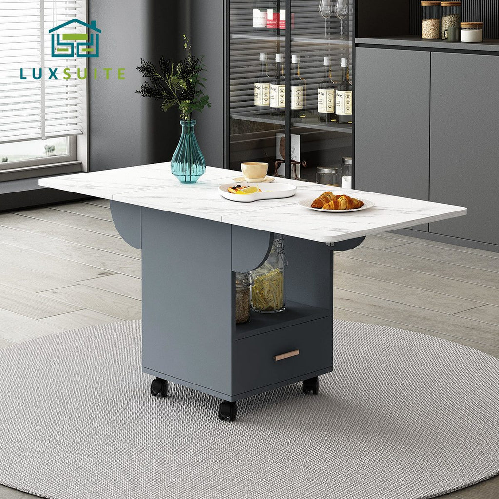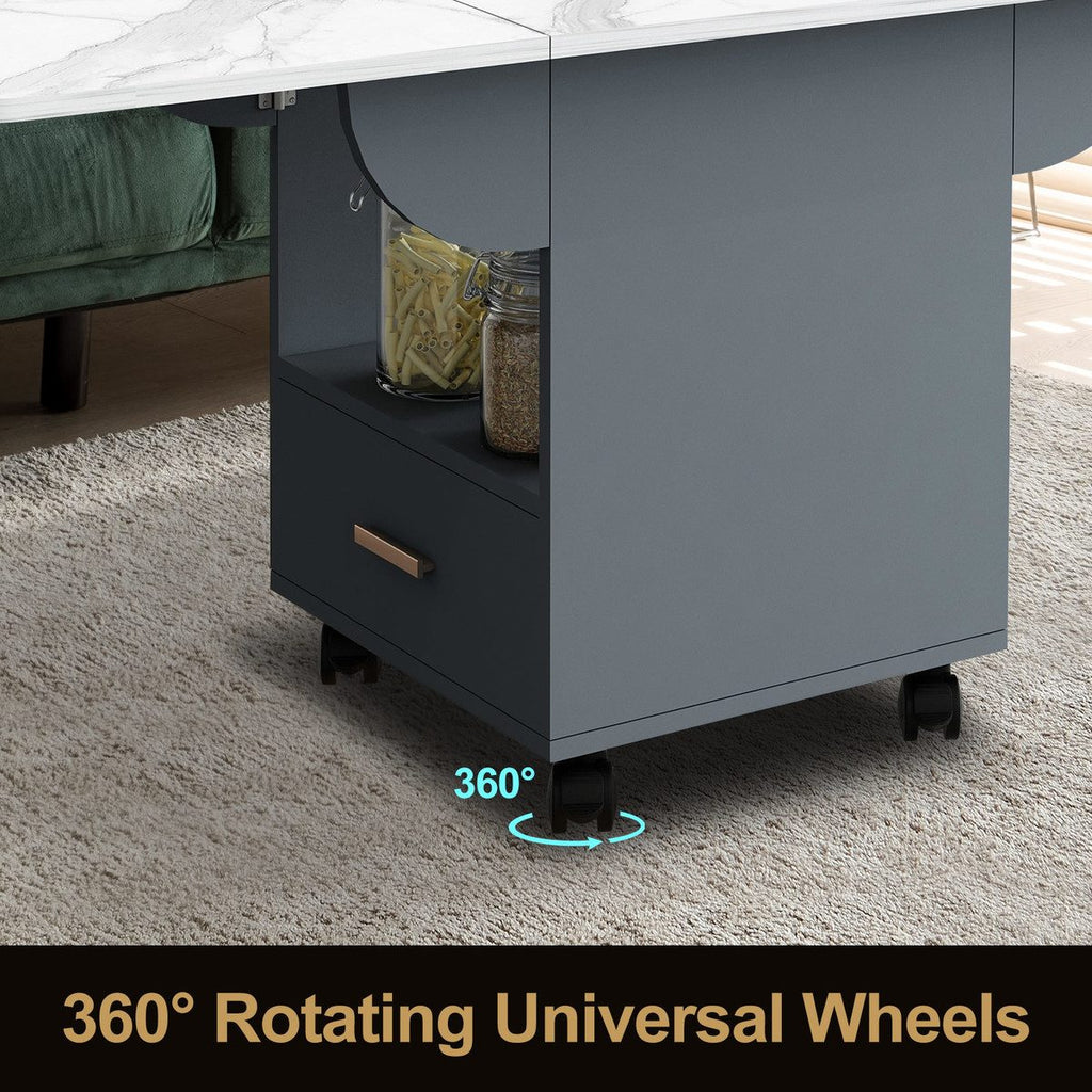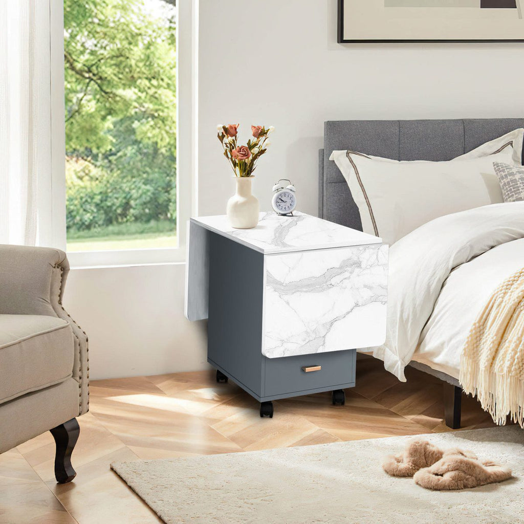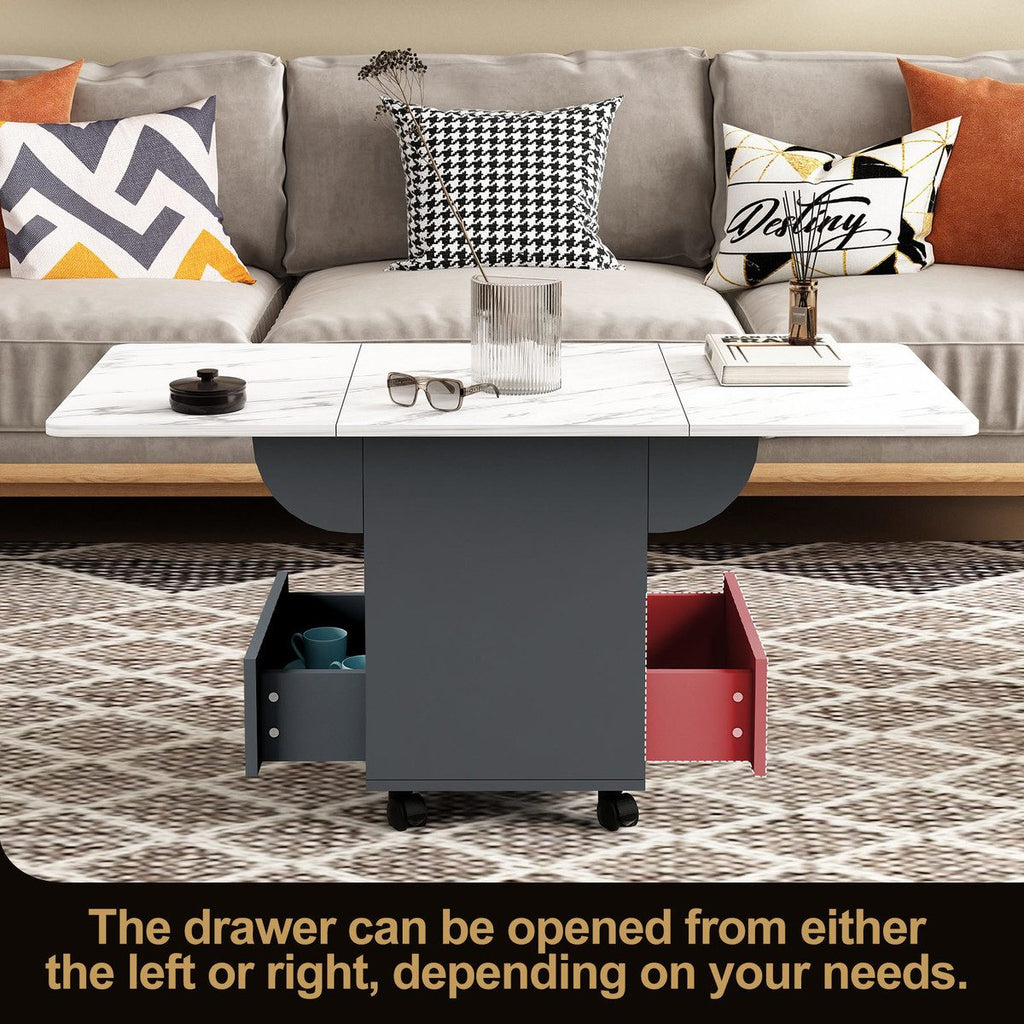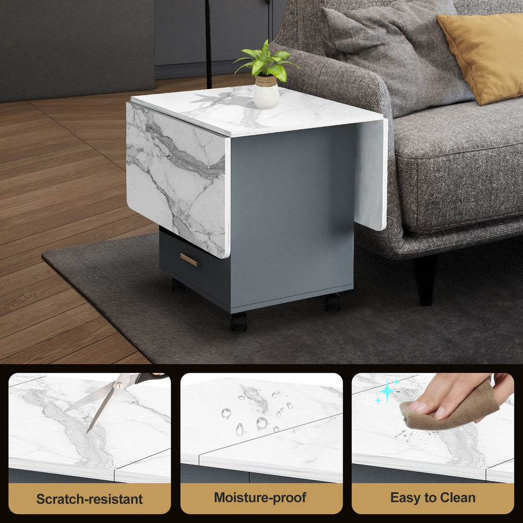 Transform your space and your life with this folding table. The high quality and eco-friendly particle boards are accented with a stylish marble finish to elevate your home’s functionality and style. This multifunctional table transitions easily between a dining table, coffee table, side table, or bedside table. Plus, this extendable table boasts three modes: double folding, sided folding, or non-folding for maximum flexibility. Besides, the large drawer can be pushed left or right, offering ample storage space for your necessities. The non-slip bearing wheels rotate 360° for unmatched convenience and mobility, perfect for any indoor or outdoor space. Ideal for romantic dinners, family meals, or kids’ play and study sessions, this end table is easy to clean and maintain, making it an indispensable piece of your home decor.