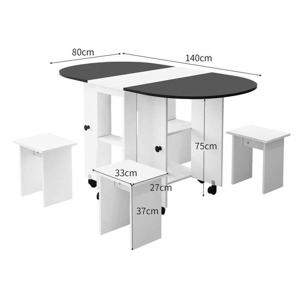 Specification Material:Particle Board Table Size:140x80x75cm Chair Size:33x27x37cm Colour:Black+White Package Contents 1 x Foldable Dining Table 4 x Chairs 1 x User Manual 1 x Pack of Accessories