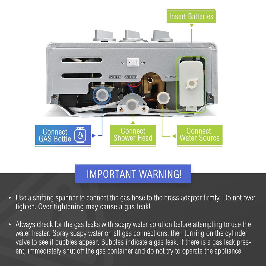 Product This instant gas water heater is able to deliver hot water even with lower water pressure as 15kPa. This hot water heater, with a maximum flow rate of up to 8L per minute, supports multiple users. Qualified with Australian AS2658 standard, this gas hot water heater provides continuous hot water and maximum safety for each and every shower. Thanks to its anti-dumping device and waterproof device, gas will automatically shut-off when the heater falling down or being exposed to water.