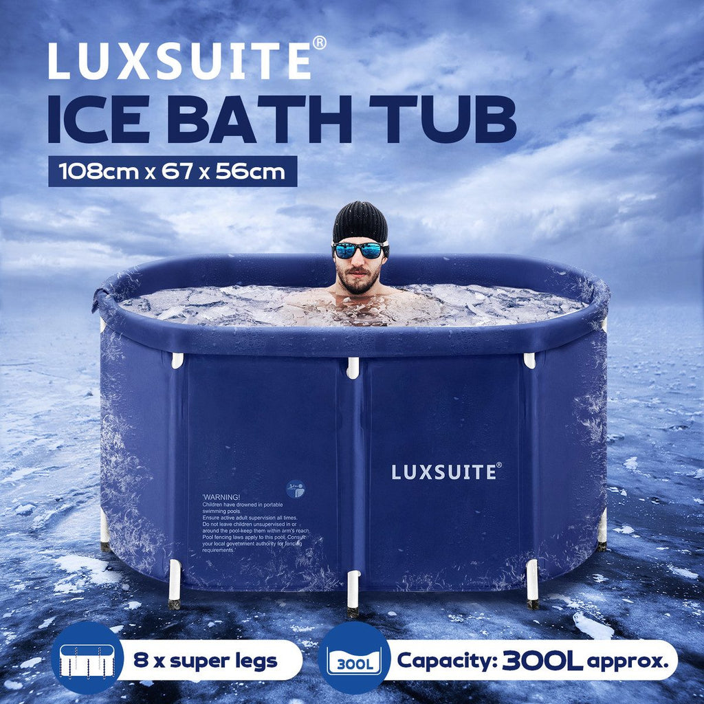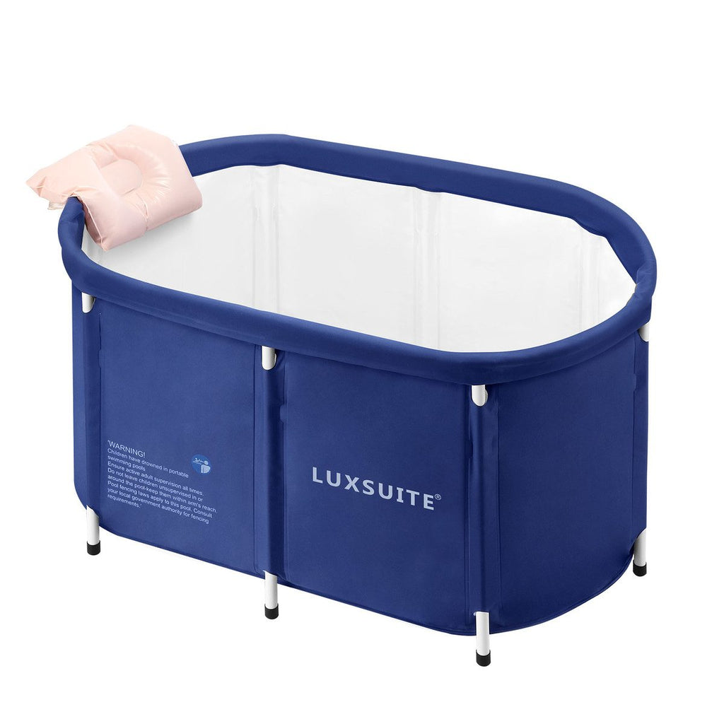 Specification Brand:LUXSUITE Colour:Blue Material:PVC + Nylon Size:108 cm x 67 cm x 56 cm Capacity:300 L approx. Package Includes 8 x Support Frames 1 x Bracket Circumference 1 x Portable Bathtub 1 x Faucet 1 x Drain Pipe 1 x Cushion