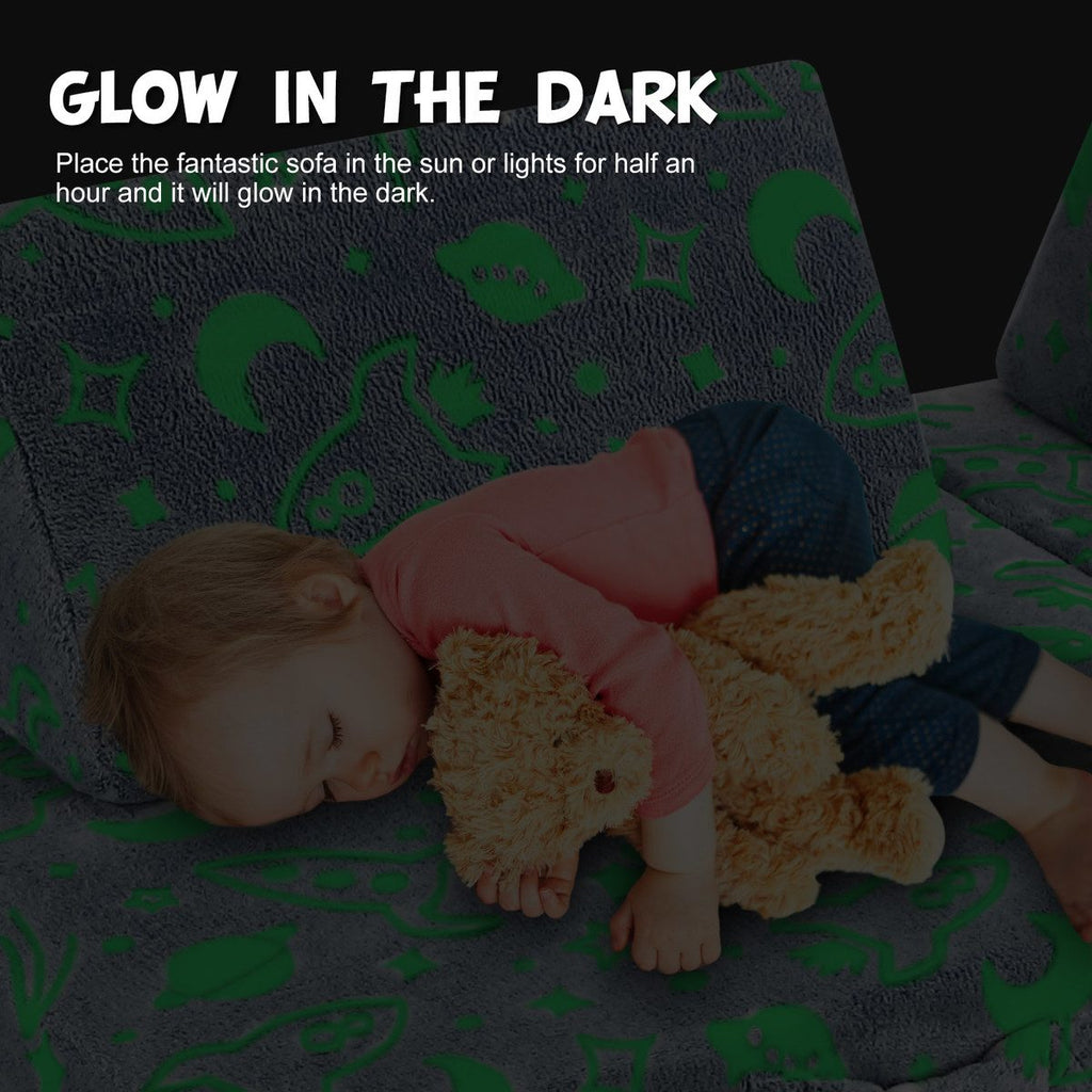 GLOW IN THE DARK SOFA: Expose the glow-in-the-dark kids couch to a bright light or daylight, turn off the lights at night and watch the magic happen. The glow light will create a dreamy atmosphere in your bedroom.