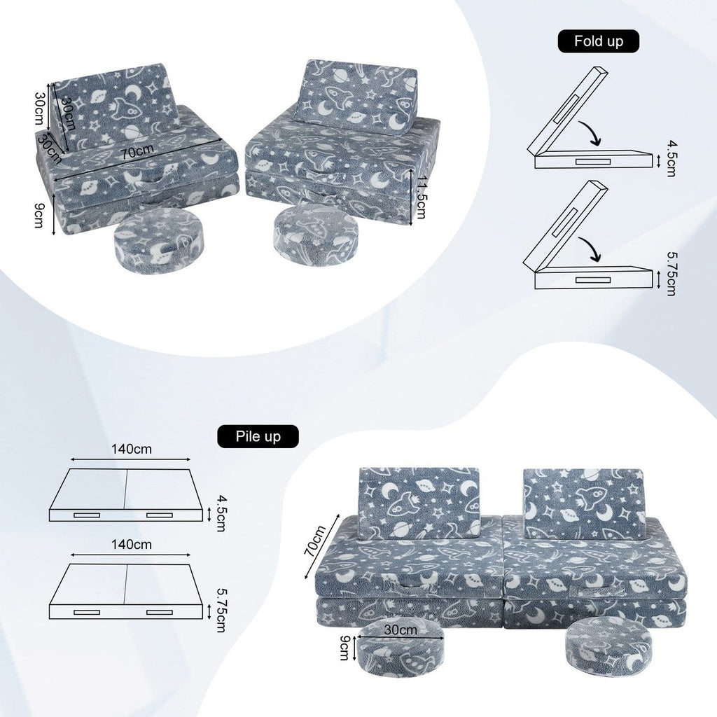 Specification Type:Modular Sofa Cover:Glowing Flannel Filling Material:High-density Sponge Colour:Grey Age Range:3+ Thin Pad A Size Unfold Size:140x70x9cm Fold Size:70x70x18cm Thick Pad B Size Unfold Size:140x70x11.5cm Fold Size:70x70x23cm Triangle Pillow Size:50x30x26cm Round Pad Size:30x30x9cm