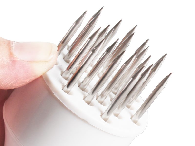 This meat tenderizer tool piercing spikes break down tough meat fiber, makes it more tasty. Heavy-duty spring-loaded mechanism controls perfect to improve the texture and taste of poultry, fish and beef, while also hastening the marinating and cooking time. A practical solution for turning a tough cut of meat into a delicious, tender piece of meat.