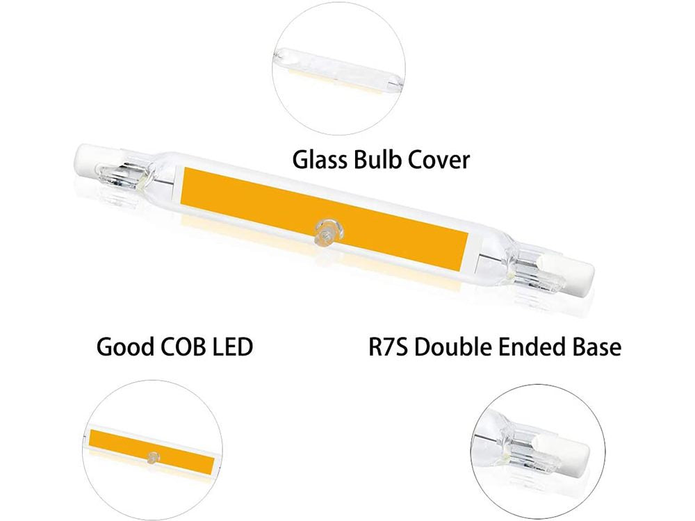 A brand new Dimmable COB LED Lamp Bulb Glass, Double-End R7S LED Glass Lamp Tube, Warm White Light, 2800K-3100K. The brightness increased by 30% then other chips, and more power saving than halogen lamp that can directly replace halogen lamps.