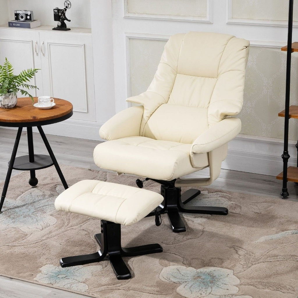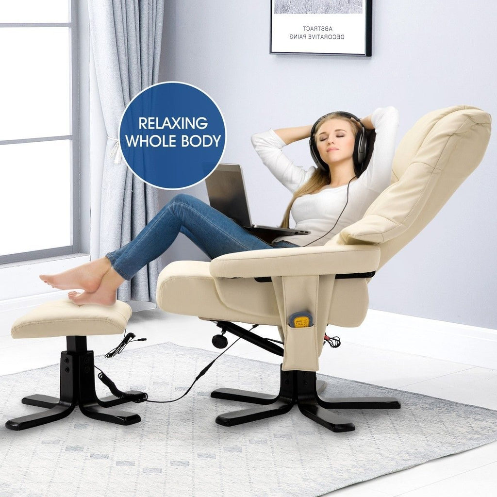 Product Relieve stress and relax with a soothing Full Body Massage Recliner Chair 8 Point Heated Office Chair. This heated armchair comes in elegant beige, a sturdy wooden frame, premium PU leather and extra-thick padding. It endures up to 150kg and reclines from 100 degrees to 120 degrees. Featuring eight heated massage options and a comfortable footrest, the computer chair with a 360-degree swivel soft seat can soothe your lower and upper back, lumbar, thighs and legs. Designed with high performance and great value, the massage office chair is easy to clean and maintain, serving for years to come.