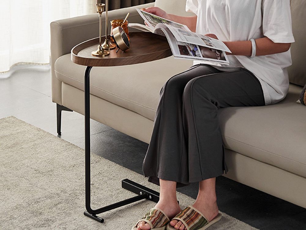 - The C table can easily slide under the sofa or bed. It's a cool addition to your living room or bedroom, featuring a sleek c-shaped couch table with a classy metal frame.