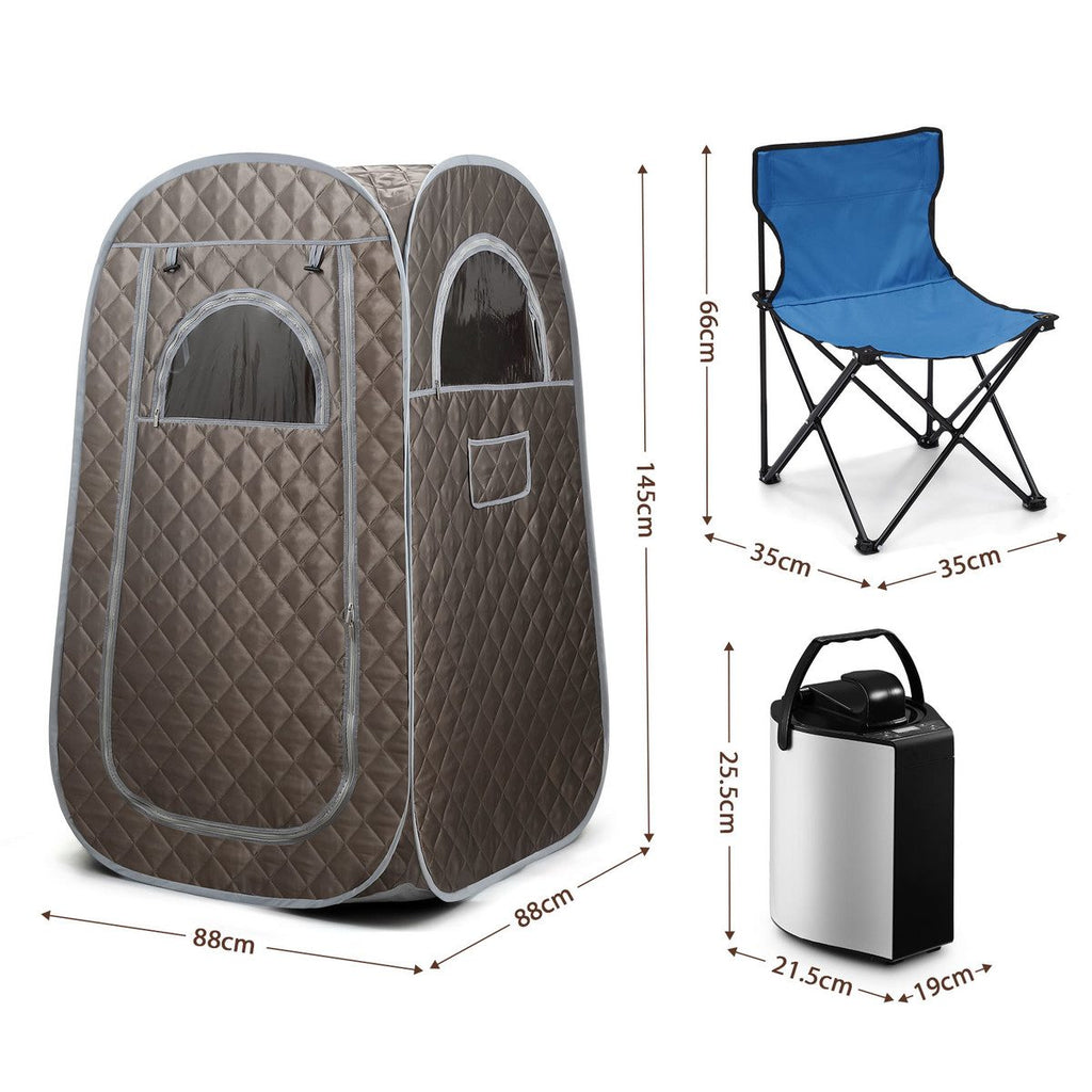 Specification EESS Number:E2023095561 Colour:Grey Material:Polymer aluminum mesh + ABS + Stainless Steel Size:88 x 88 x 145cm Steam Pot Capacity:3L Voltage:240V/50Hz Power:700W-1000W Temperature:1-9 level Timer:10 minutes per time, up to 90 minutes Function:Sauna therapy, body spa Maximum Steam Temperature:65°C Package Included 1x Sauna Room 1x Tent Carry Bag 1x 3L Steamer 1x Portable Chair 1x Chair Carrying Bag 2x Steam Hose 1x Blanket 1x User Manual 1x Pill Case 1x Remote Controller 1x Remote Controller (Uses 2xAAA batteries; batteries not included)