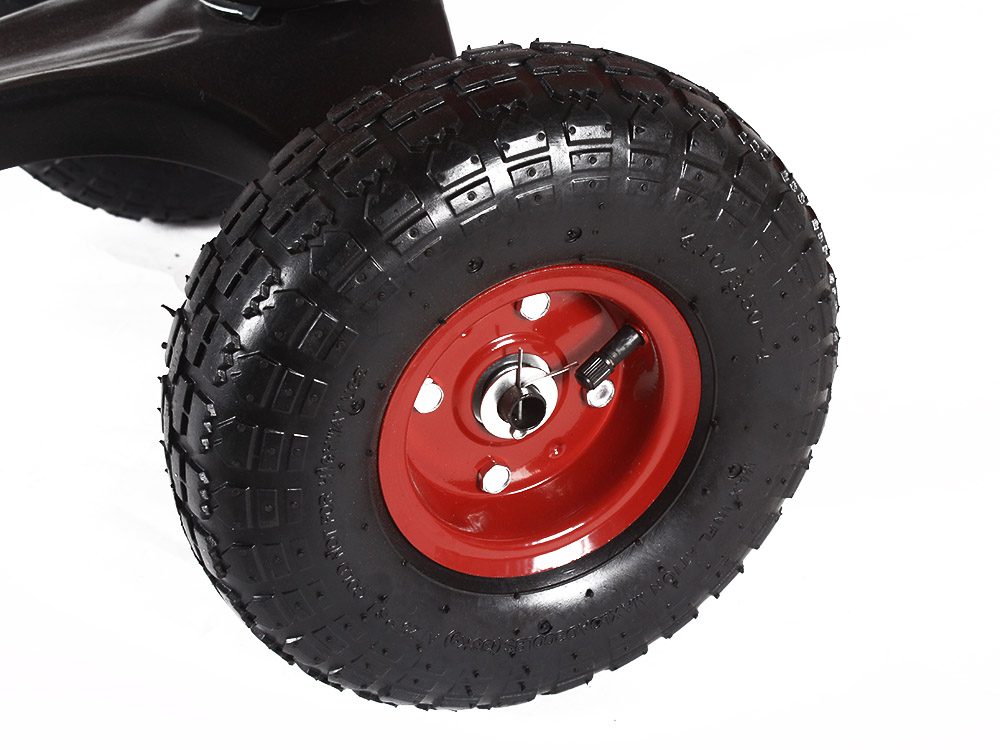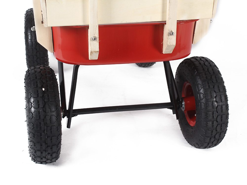 - Sturdy metal wagon bed with red powder-coated finish