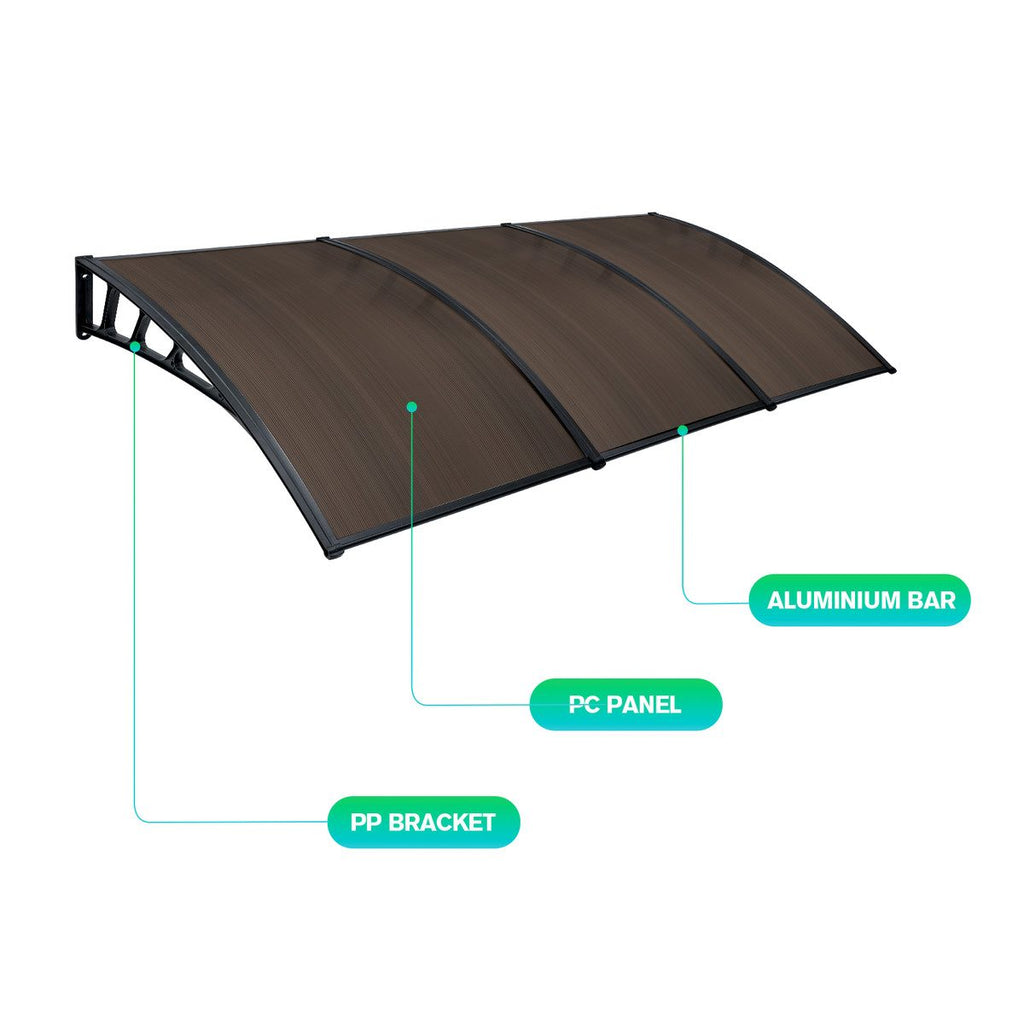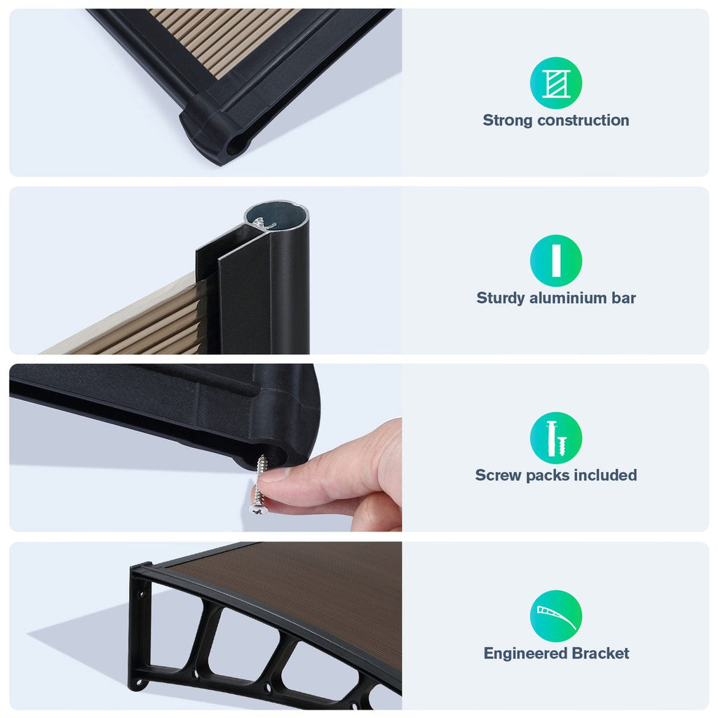 The window awning is an attractive and functional way to easily resist rain or scorching sun. Featuring a sleek and modern design, the door awning is a perfect shelter for windows, doorways, patios, and decks. Not only will the canopy create an inviting entrance for your home or business, but it will also protect you and your visitors from sun, rain, and snow. Measuring 1.5x3x0.33m, the outdoor awning is made from strong and durable 6mm-thick polycarbonate panels with PP engineering brackets and aluminium bars. The high-quality construction contributes to outstanding performance and provides superior sturdiness and strength. In addition, the patio cover is easy to assemble, mount, or remove and requires minimal maintenance.