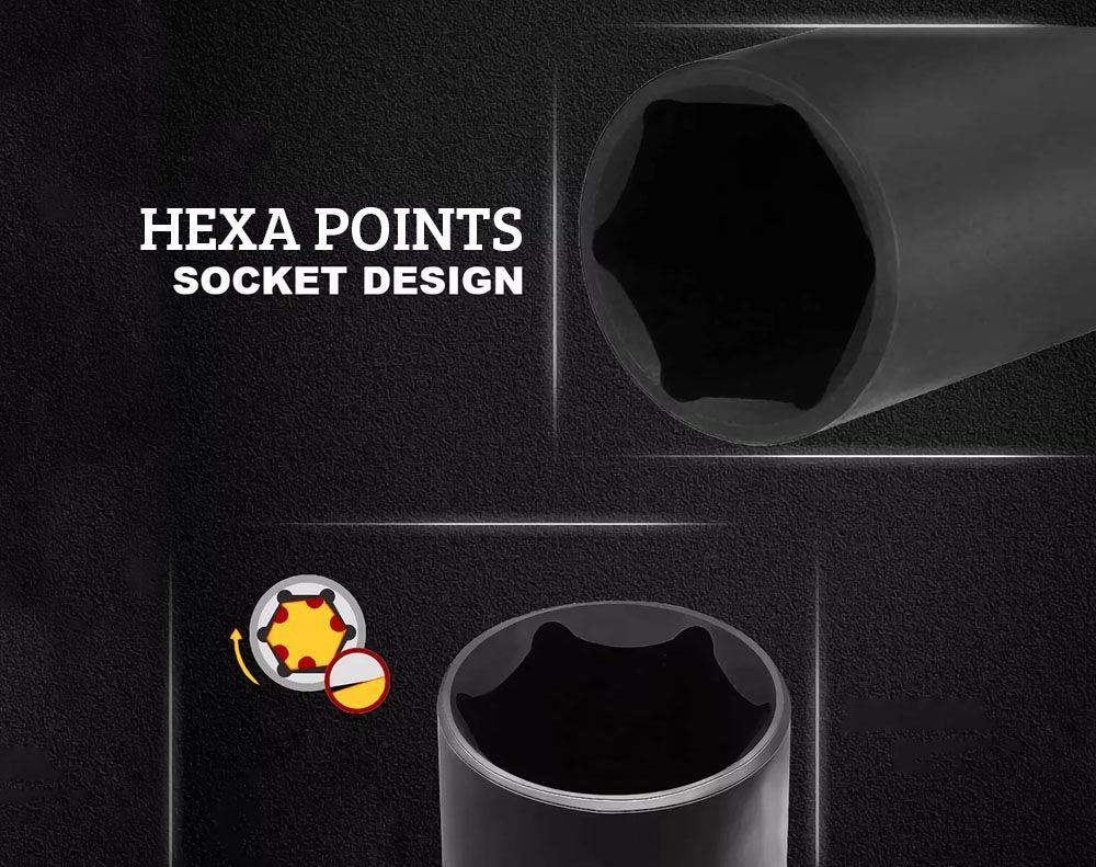 6-point hex socket design prevents round-off deterioration under high torque and hammering stress with the use of impact or electric wrenches. Black Sodium Hydroxide surface finishing for anti-oil, anti-rust, and anti-scratch.