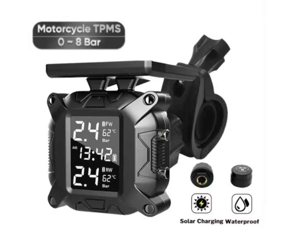 Enhance your motorcycle safety with our advanced solar-powered TPMS. Continuously monitor your tire pressure and temperature in real-time with this wireless system. Featuring a user-friendly LCD display and audible alarms, you'll receive instant alerts for low pressure, high temperature, or leaks. The IP67 waterproof sensors are built to withstand harsh riding conditions, while the solar panel ensures long-lasting battery life. Improve your motorcycle's performance and safety with this essential accessory.