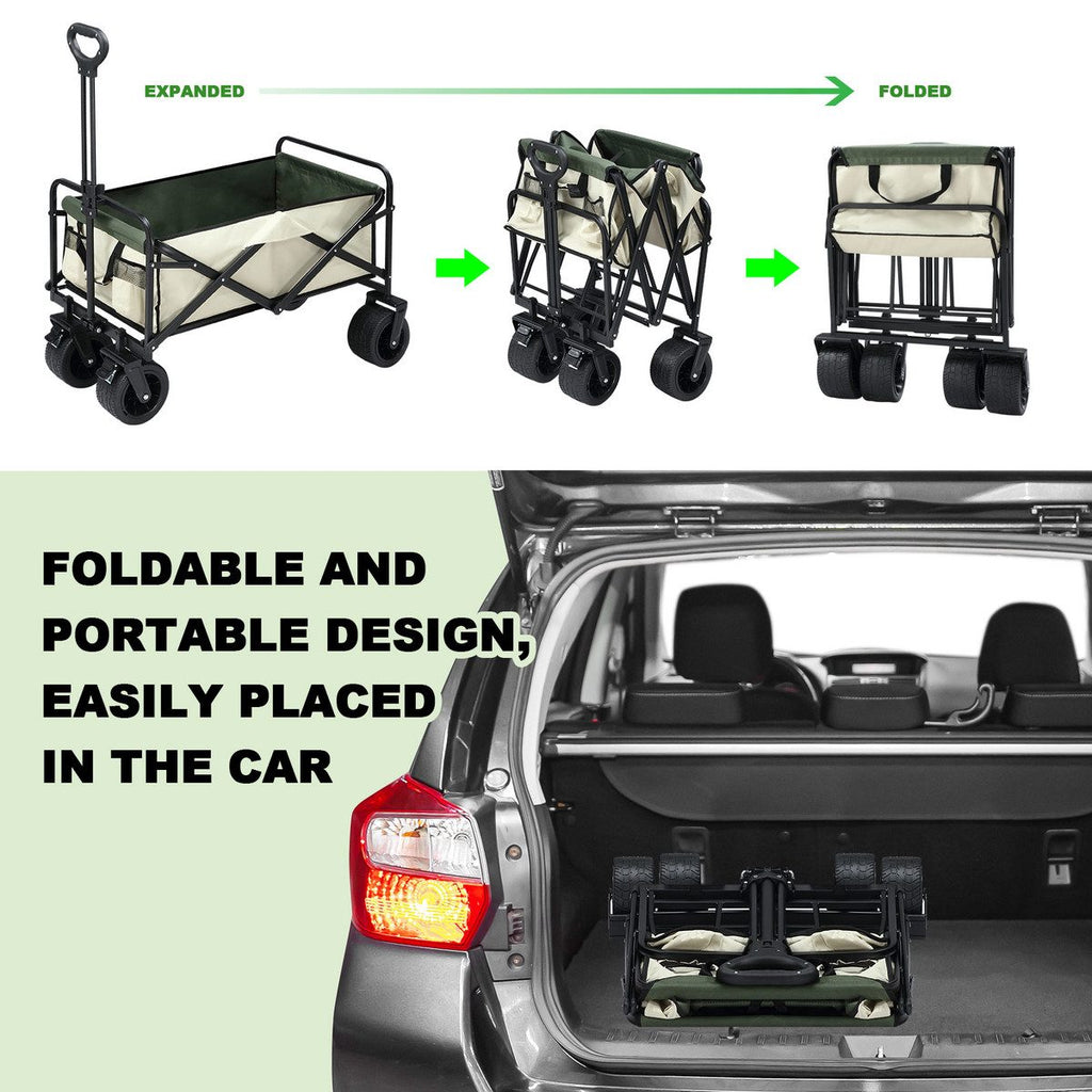 All-Terrain Wheels Wagon: This heavy-duty folding trolley with 17x10cm wheels is not just for the sandy beach, outdoor activities, gardens, parks, camping, and shopping, but for snow, dirt, street, or grass manoeuvring. Specification Material:Carbon Steel + Oxford Cloth Product Size:90x51x60cm approx. Carton Size:60.5x18.5x74.5cm approx. Gross Weight:13.6kg Colour:Beige + Green