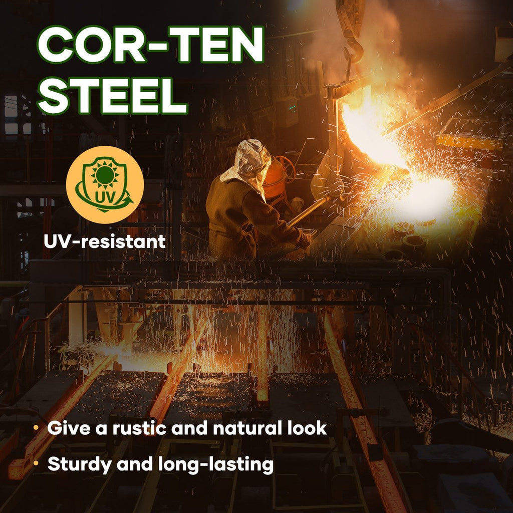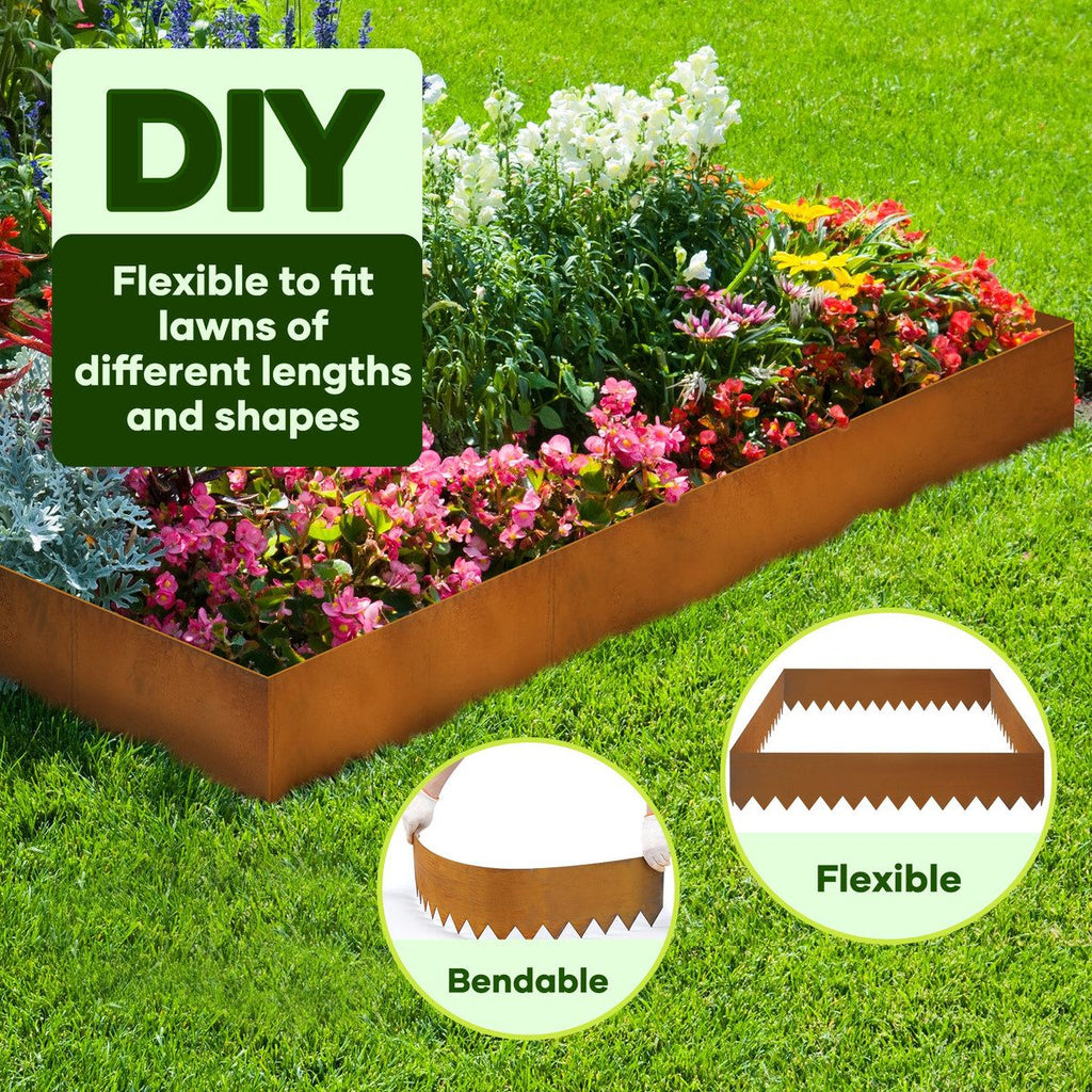 Unleash your creativity and redefine your outdoor space with our 6-pack garden edging set. Its sturdy Cor-Ten steel construction ensures longevity and sturdiness, while the unique pre-rusted design introduces a touch of modern elegance into your landscaping and withstands severe weather conditions. Effortlessly shape and install this bendable lawn edging thanks to its sharp saw teeth and hammer-in design. Moreover, maintain your garden with ease, as the edging can be conveniently removed and rearranged to accommodate new bed layouts. Protect and DIY your garden beds, lawns, and pathways with our versatile and flexible landscape edging.