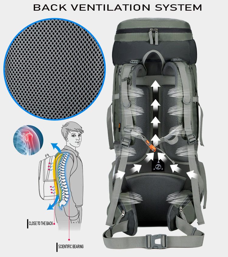 -LARGE HIKING BACKPACK: The hiking backpack with rain cover is made from lightweight, waterproof nylon fabric with durable smooth zippers. The top of the main pocket is designed with elastic drawstring which can expand for more storage space. -WATERPROOF BACKPACK: This hiking backpack has 2 mesh side pockets, 1 front pocket, 1 bottom pocket, 1 large main pocket with 1 hydration bladder compartments inside. You can put your sleeping bags, clothes, towels, shoes or cooking gear in this rucksack backpack, perfect for 4-6 days outdoor adventure. -LIGHTWEIGHT BACKPACK: The waterproof hiking backpack weight :1.65kg,the backpack size: 32x80x22cm. This large hiking backpack for men and women can meet size requirements for most airlines and very well used in outdoor survival, cycling, camping, trekking, climbing, etc. -COMFORTABLE BACKPACK: The ergonomically designed adjustable shoulder straps and the suspension system allows gravity to more evenly disperse pressure and weight down throughout the back. And adjust the tightness as you need, For tying up your pack or hanging tent, sleeping mat, hammock, trekking poles etc.