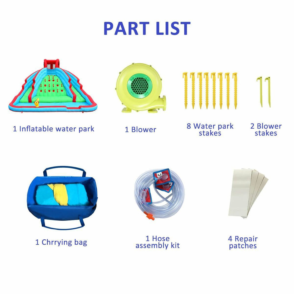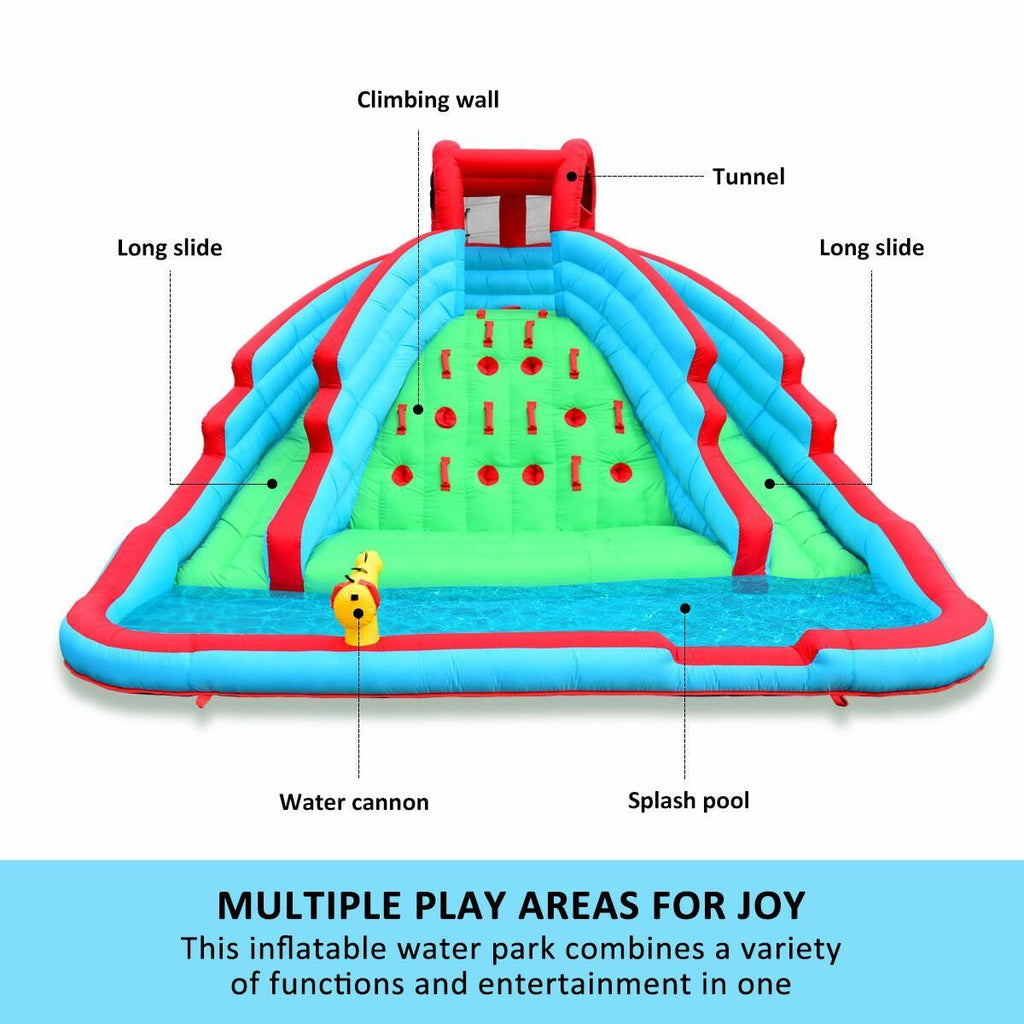 Product Enjoy the fun of water slides with this inflatable jumping castle. With multiple play areas including a huge splash pool, two large water slides, a huge climbing wall, a cannon, and a castle, the inflatable water park offers a variety of games for kids to play at the same time. Made of excellent oxford cloth, the water slide is easy to clean and has a long life span. The bouncer stake in each corner adds more stability and firmness to the whole jumping castle. Moreover, it only takes you few minutes to inflate this jumping castle. After use, you could deflate it quickly and store it in a carrying bag. The water slide is easy to store and transport so that you could set it up in the park, garden, lawn, courtyard, etc.