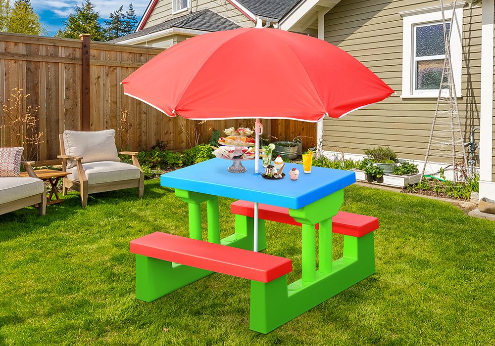 Features: Kids Picnic Table Brightly Coloured Perfect for Arts and Crafts Sturdy Durable Construction Made from Polypropylene Plastic Comes with Umbrella for UV Protection Easy to Assemble Instructions Included
