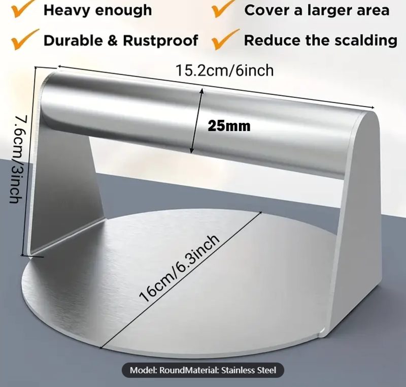 - Humanized Design Burger Smasher. The 16cm Round Burger Smasher Fits Most Skillets, It Is Meticulously Welded And Ground For A Comfortable Feel That Won't Hurt Your Hands.