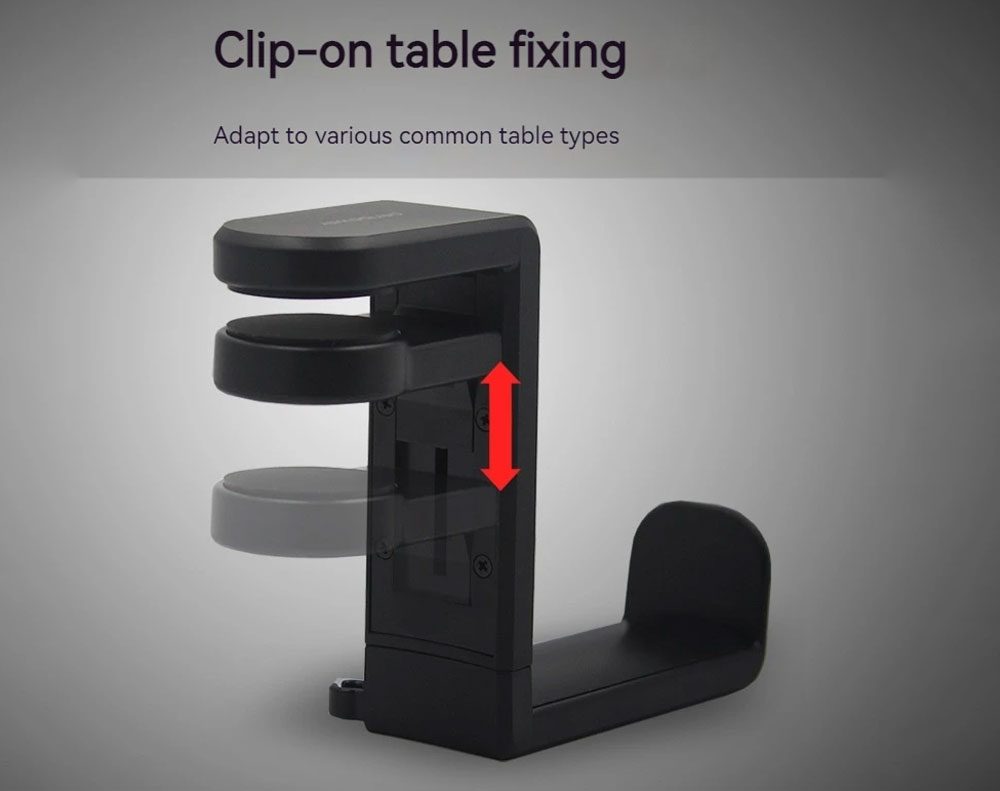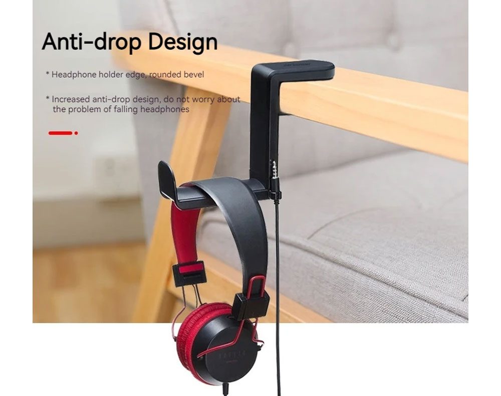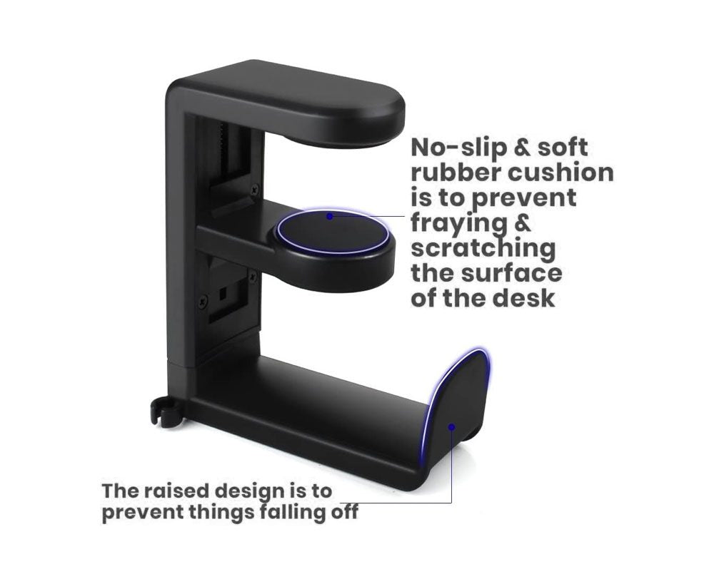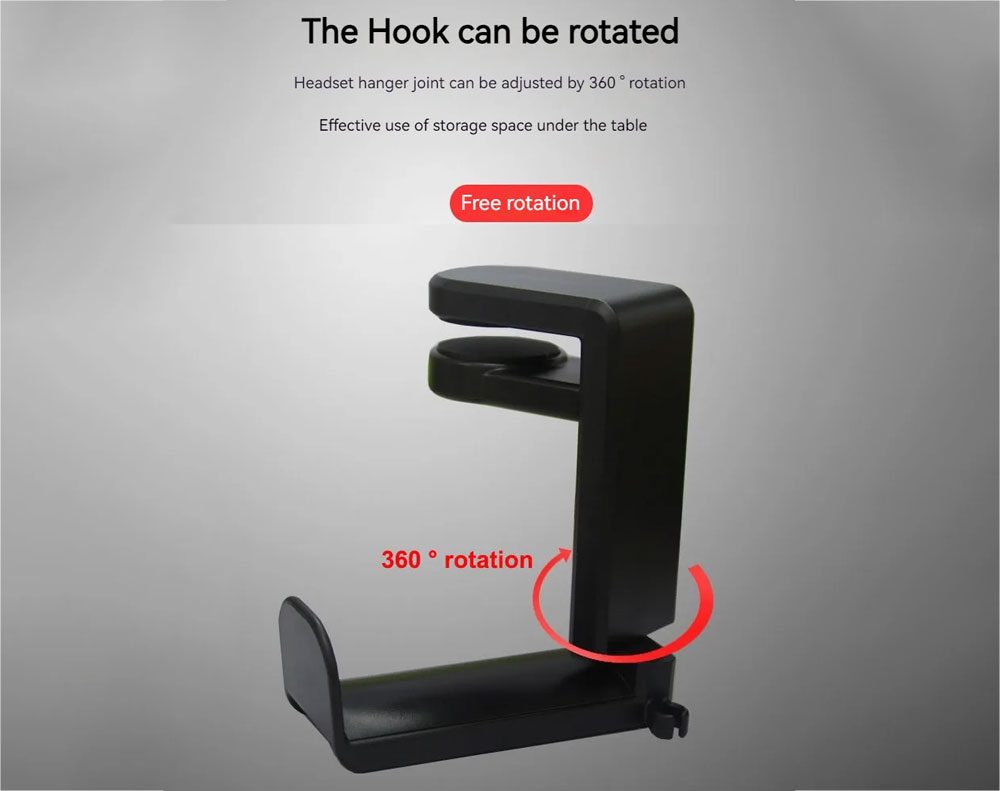 Maximize your desk space and keep your headphones organized with our adjustable under-desk headphone stand. This Headphone Hanger Featuring a rotating arm and built in cable clip, this versatile stand accommodates various headphone styles and sizes. The sturdy clamp securely attaches to your desk, freeing up valuable surface area. Experience a clutter-free and efficient workspace with this essential gaming or office accessory