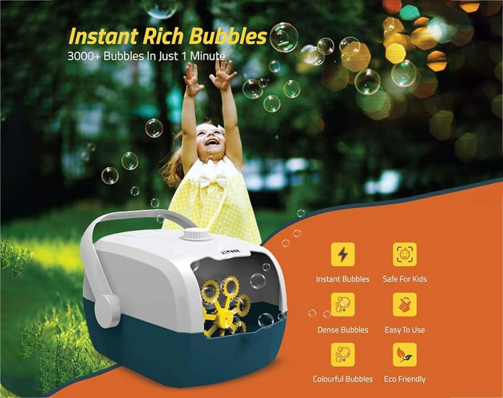 Create a magical bubble wonderland with our automatic bubble machine. Perfect for parties, indoor or outdoor fun, this machine produces thousands of colorful bubbles per minute. The large bubble tank ensures long lasting playtime, while the rechargeable battery offers convenient portability. Safe and kid friendly, this bubble machine is a must have for joyful moments and stunning photos.